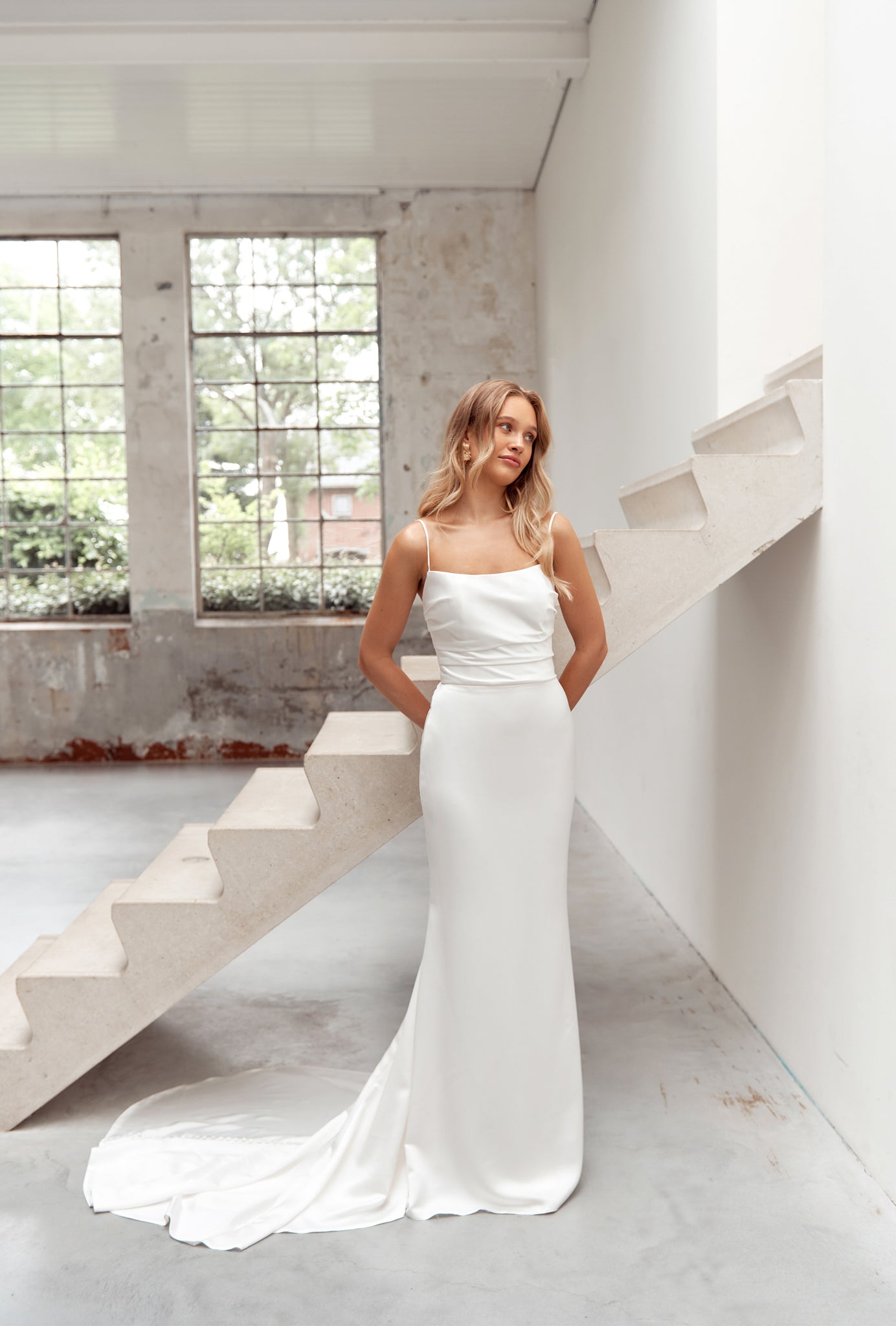 For the bride that wants to show off her style, this clean fit and flare wedding dress hits the minimalistic trend in a refreshing way. Designed in a rich charmeuse fabric, soft draping on the bodice accents the stylish scoop neckline and V-back. Spaghetti straps keep it modern while a soft jersey lining ensures you'll be comfortable all day and night. It's finished with a simple chapel length train.