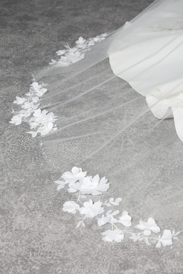 An elegant and sophisticated veil, featuring an edge of pretty scallops decorated with satin floral appliques, and outlined with pearls to show off its unique shape. Available in any of our single and two tier sizes. If ordered as a two tier, the scallops decorated with pearls continue on top of the blusher.