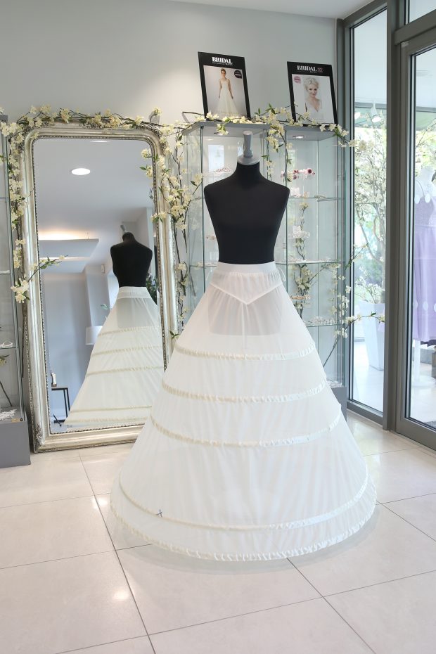 Our largest petticoat silhouette for the very fullest gowns. The waistline has been cleverly designed to slim and flatter your figure with wide elastic for support. Underneath the elastic is our special smooth double layer powernet, that gives a wonderful shape to your waist and flattens the tummy area. With five hoops structuring the petticoat, this style has no nets added, so is ideal if you want to add support to a dress that already has volume. In this exciting glamorous petticoat you can achieve those longed for breath-taking moments, as you arrive in style for your special day. A hand-tied blue bow is lovingly added for your ‘something blue’. Available to order in Ivory, Antique or White.