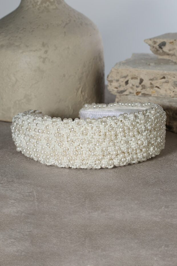 A beautifully detailed padded satin band gives height to your hairstyle, and is adorned with rows and rows of shimmering pearls and beads.