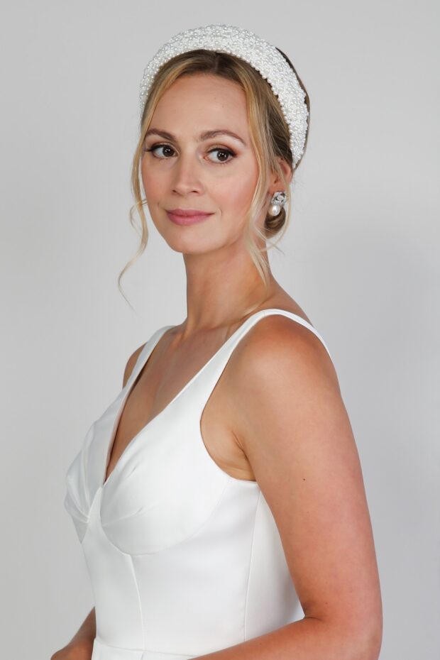 A beautifully detailed padded satin band gives height to your hairstyle, and is adorned with rows and rows of shimmering pearls and beads. Sample available to try on in our Chelmsford store. Orders take 2-3 weeks to arrive....Read more