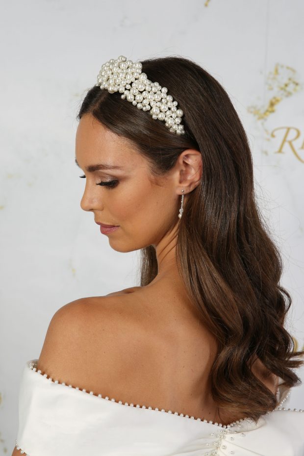 Gorgeous pearl headband, on a double band. Various sized pearls have been woven together to create a series of randomly placed clusters, that come together to form this statement piece. Contemporary and modern, this band is sure to make you stand out on your wedding day!