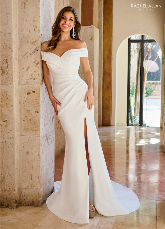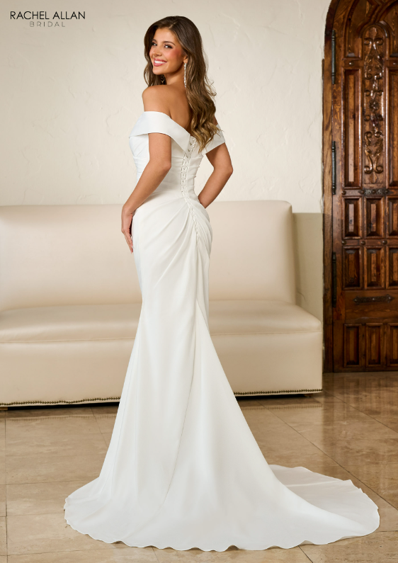 Featuring an off-the-shoulder cut and stretch crepe material for a comfortable fit, this dress is the perfect statement piece for any bride. Enhance your look with this flattering lace-up back detail, creating an air of effortless elegance. This bridal gown is perfect for any bride who wants to make a lasting impression that speaks directly to her style and personality. Look like the princess you are on your special day and show off in Rachel Allan.