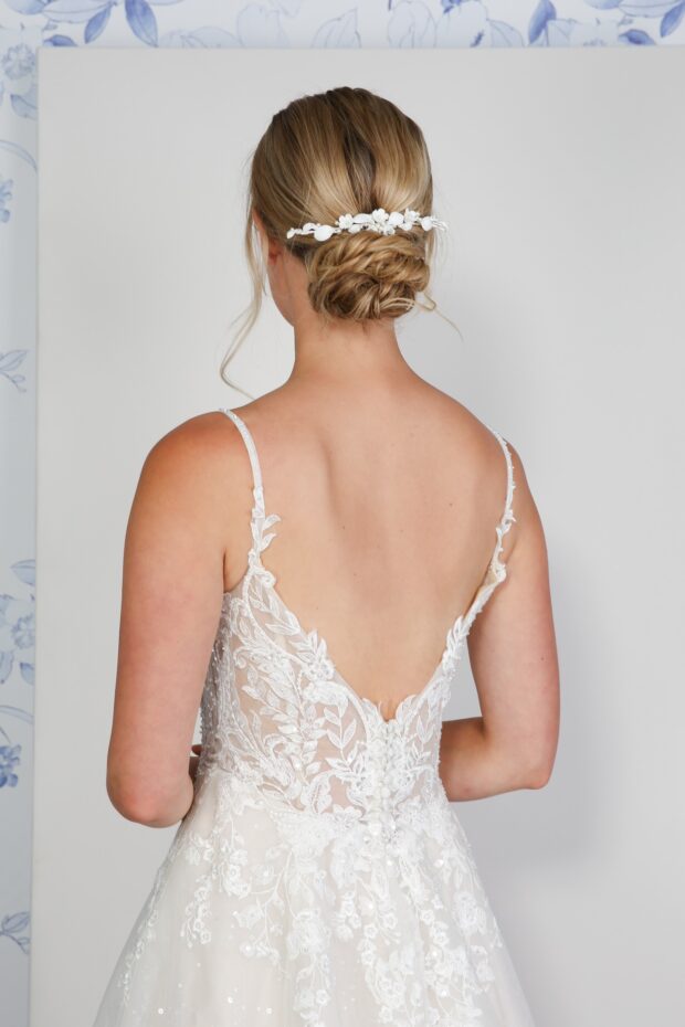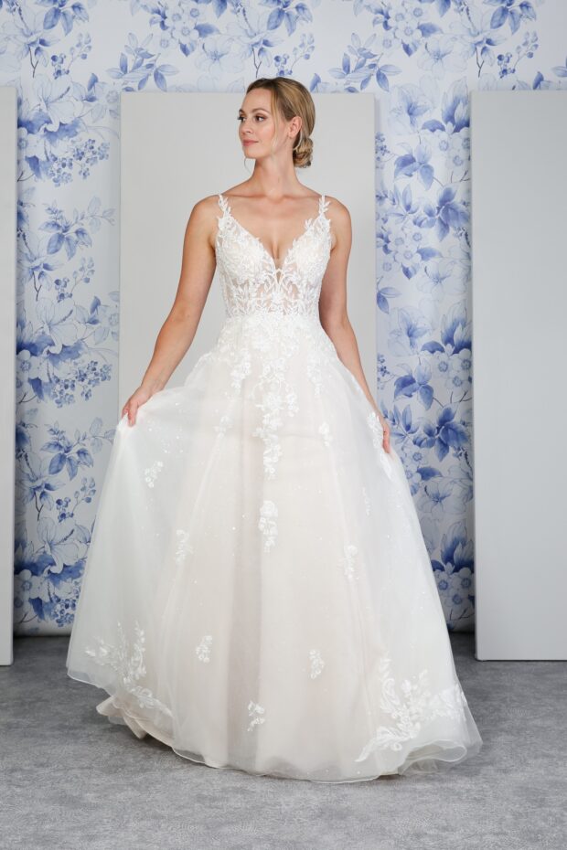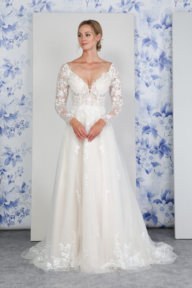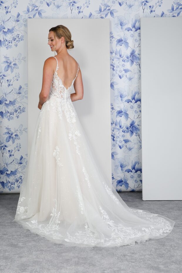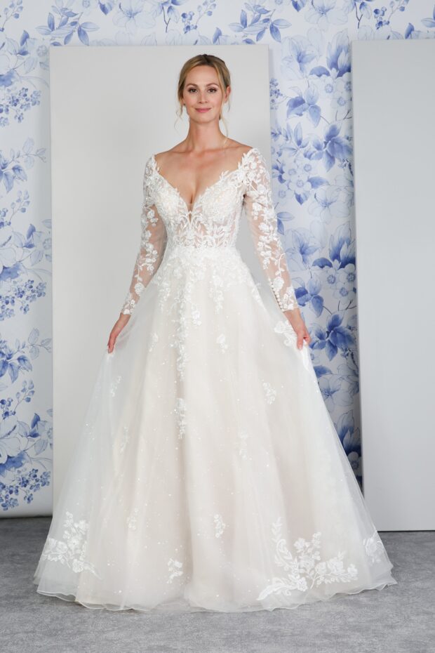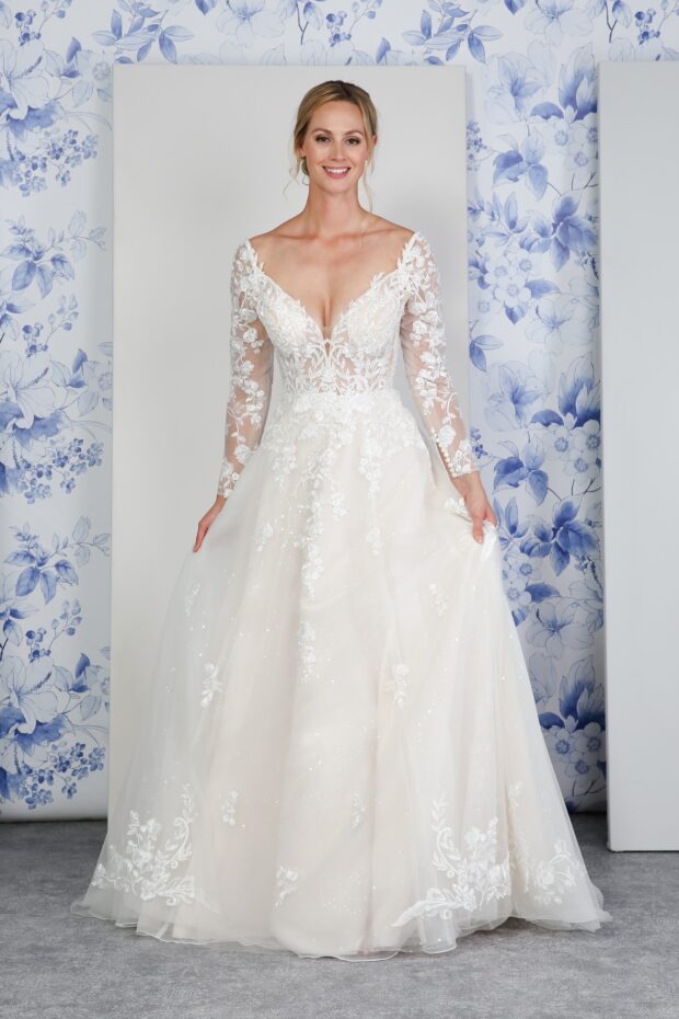 This romantic lace dress features a body-sculpting bodice with stunning wildflower lace. Light-catching sequins are peppered across the layered tulle skirt, adding a gorgeous sparkle to the soft movement of the A-line shape. The stunning open neckline gives this style such a refined and elegant feel; detachable long lace sleeves allow you to transform your look between the ceremony and the reception. This dress is available in with champagne lining as pictured or in Ivory.