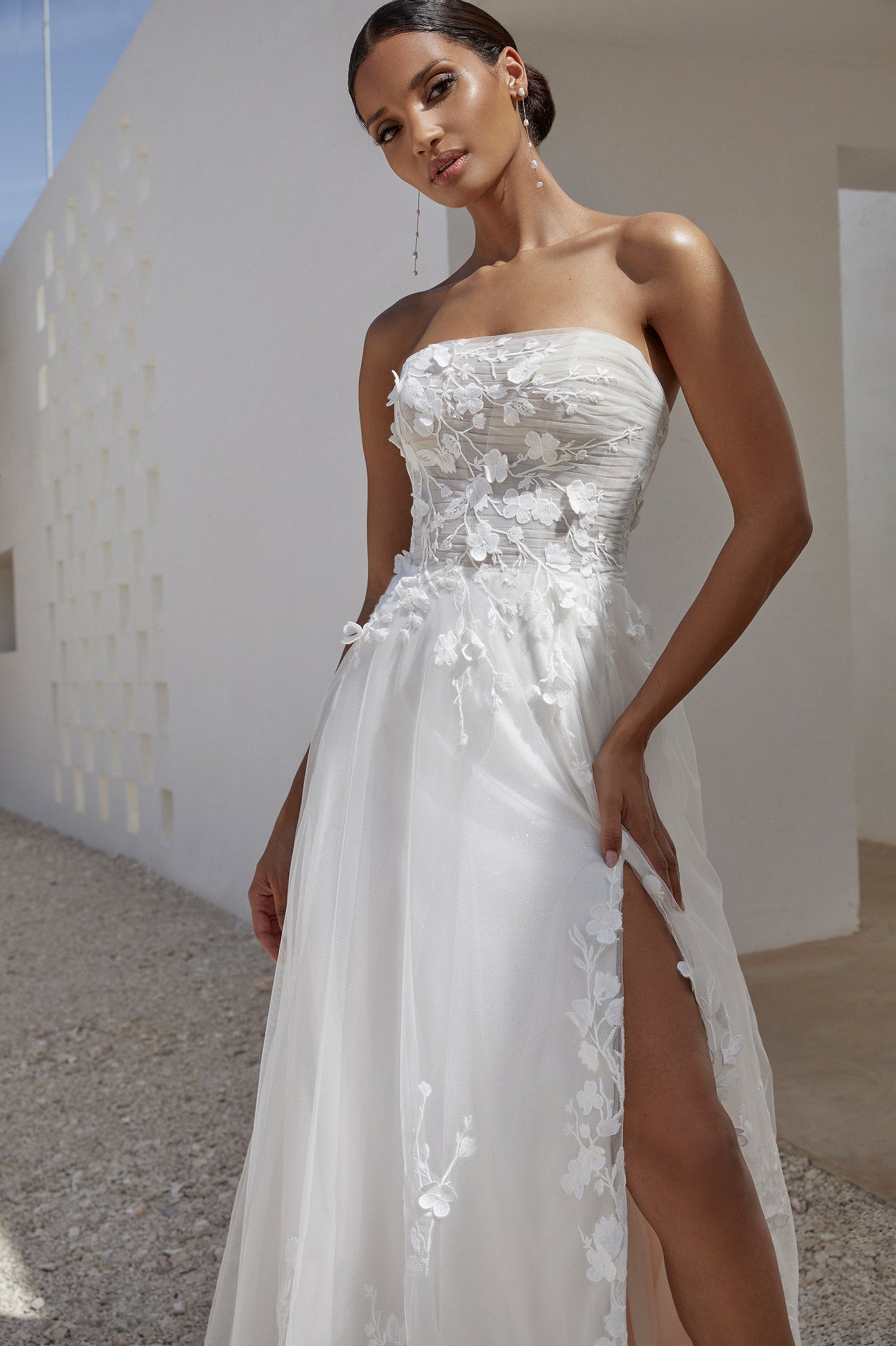 Sparkle tulle A-line with sheer pleated bodice featuring straight neckline. Gown adorned with matte cotton lace appliques detailed with 3D appliques overtop. Detailed with a slit in skirt and sweep length train. Finished with jersey lining and jersey covered buttons on back bodice. Version without skirt slit available