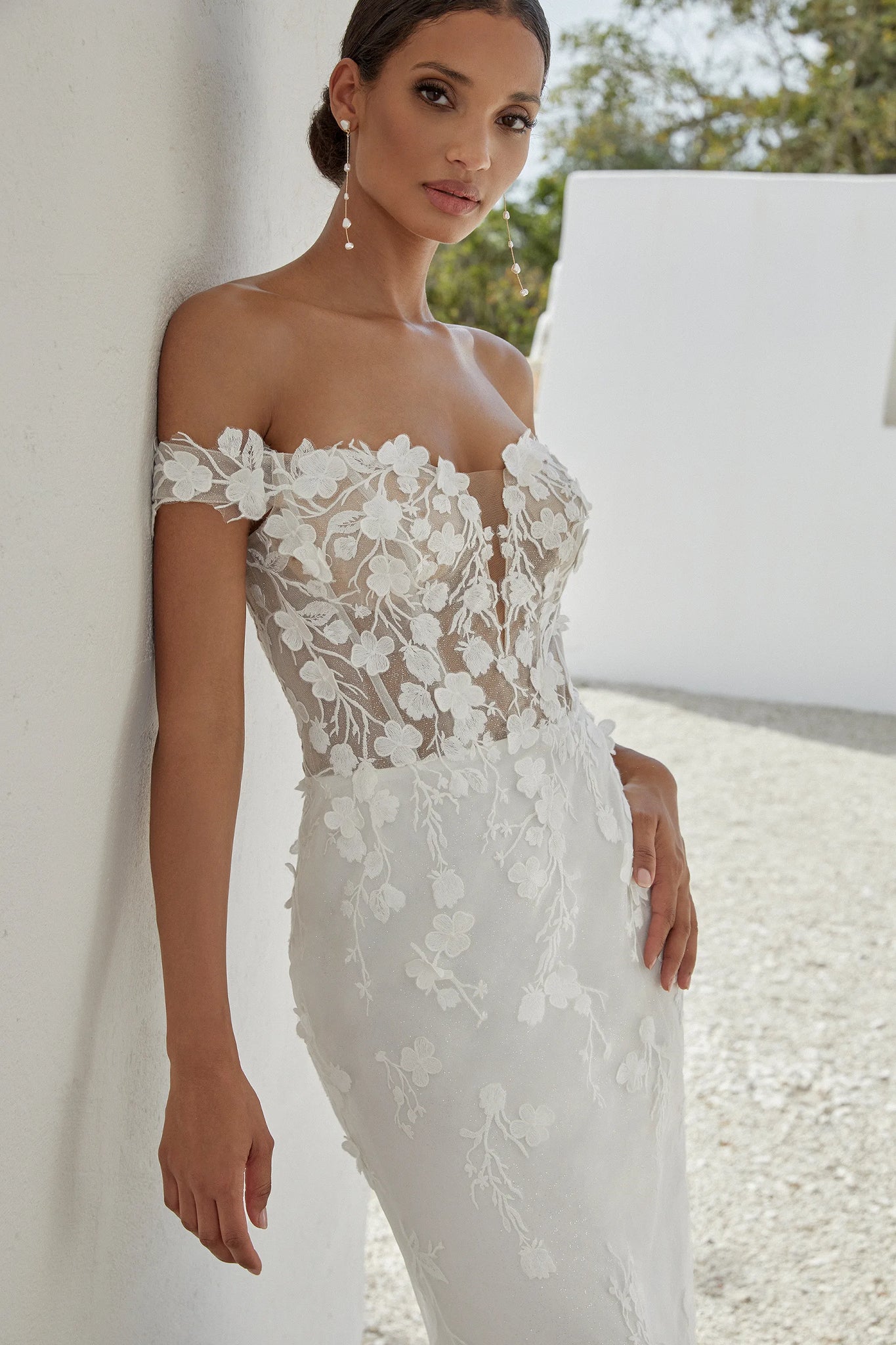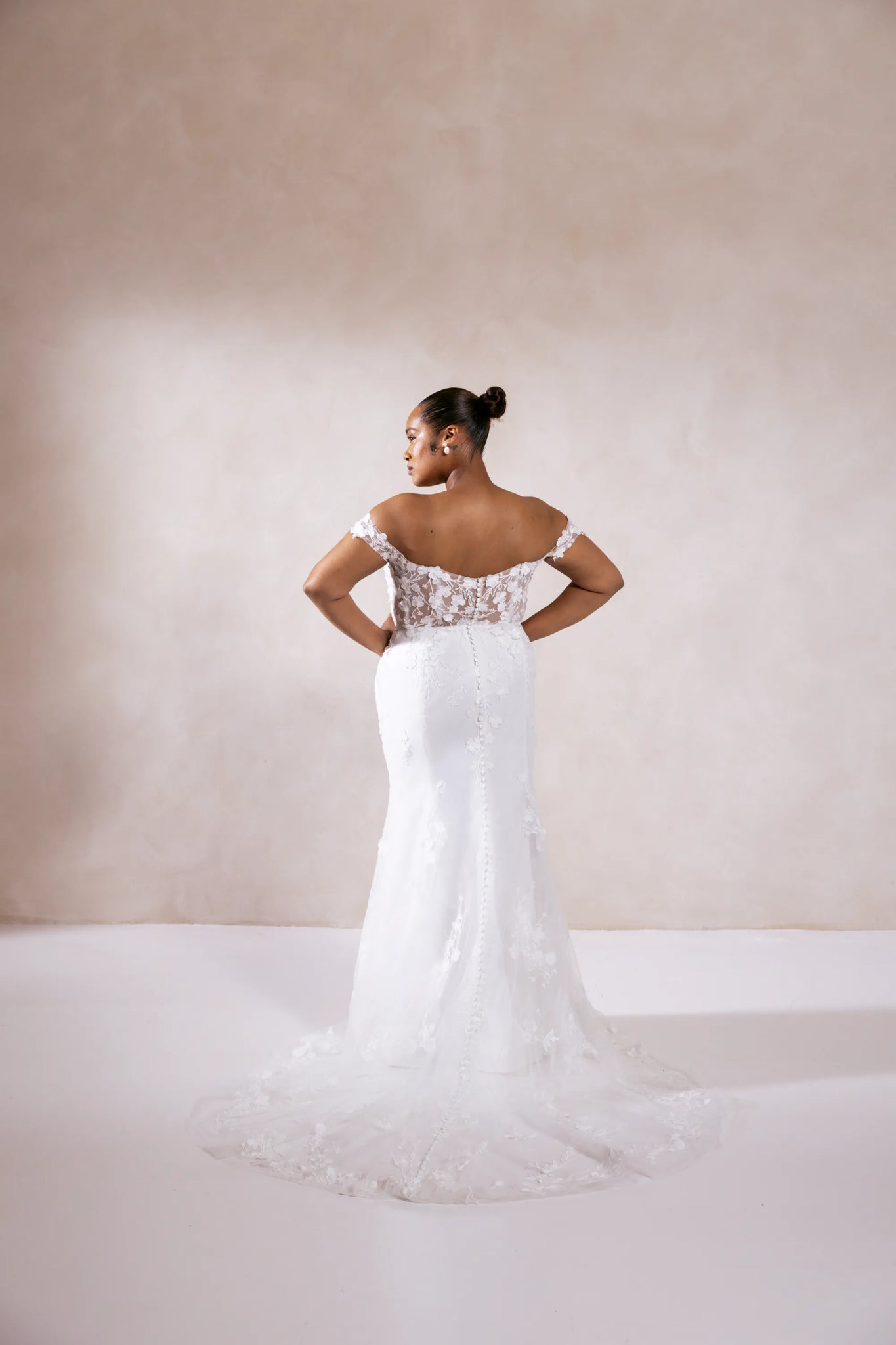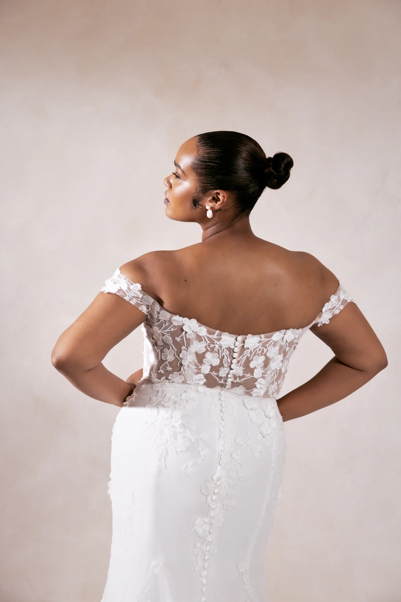 Ariana - Sparkle tulle fit and flare dress with sheer bodice and plunging off the shoulder neckline. Gown adorned with matte cotton lace appliques accented with scattered 3D appliques overtop. Complete with tulle covered buttons extending down back to end of chapel length train. Version with front bodice lined to side seams