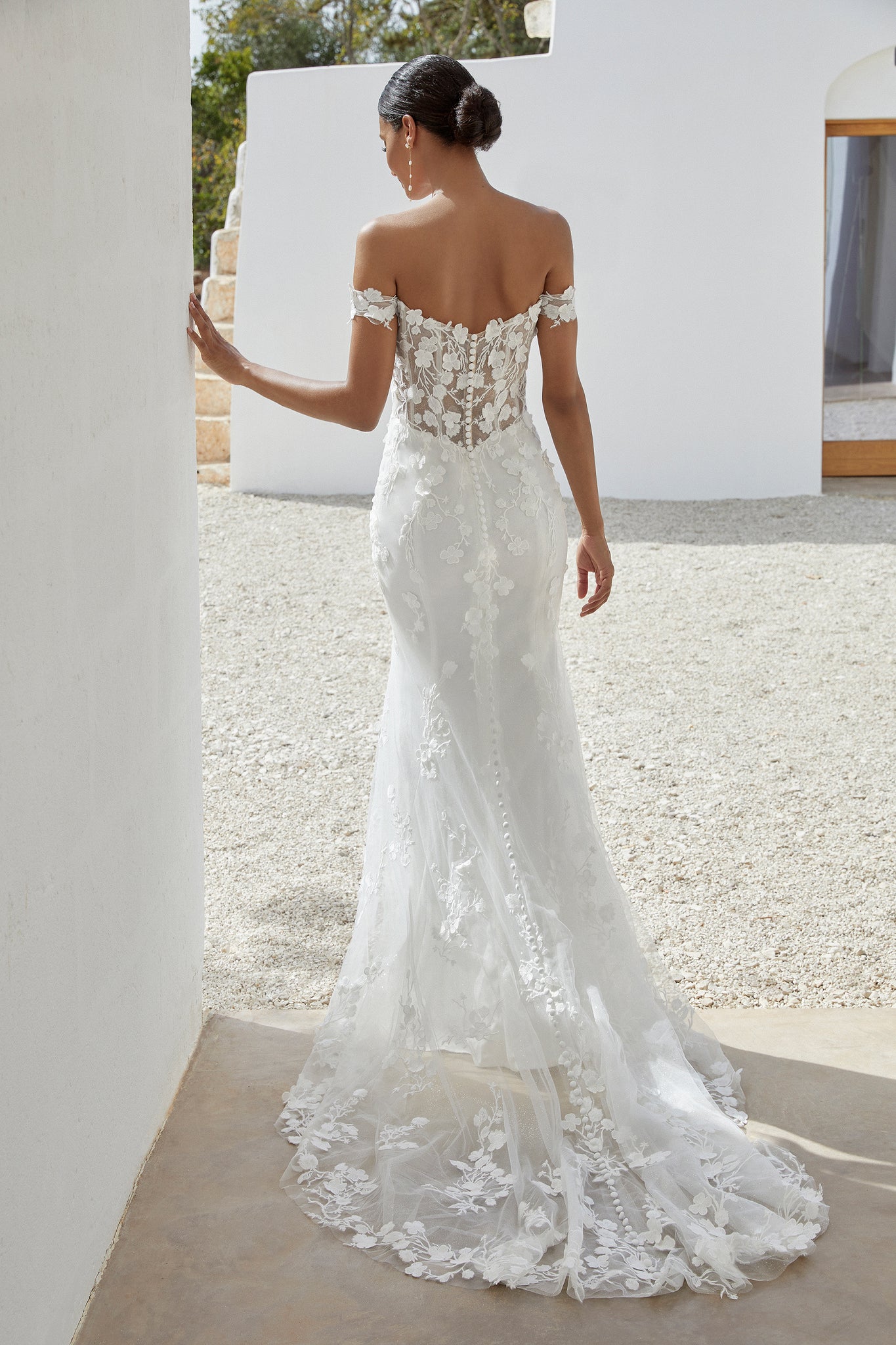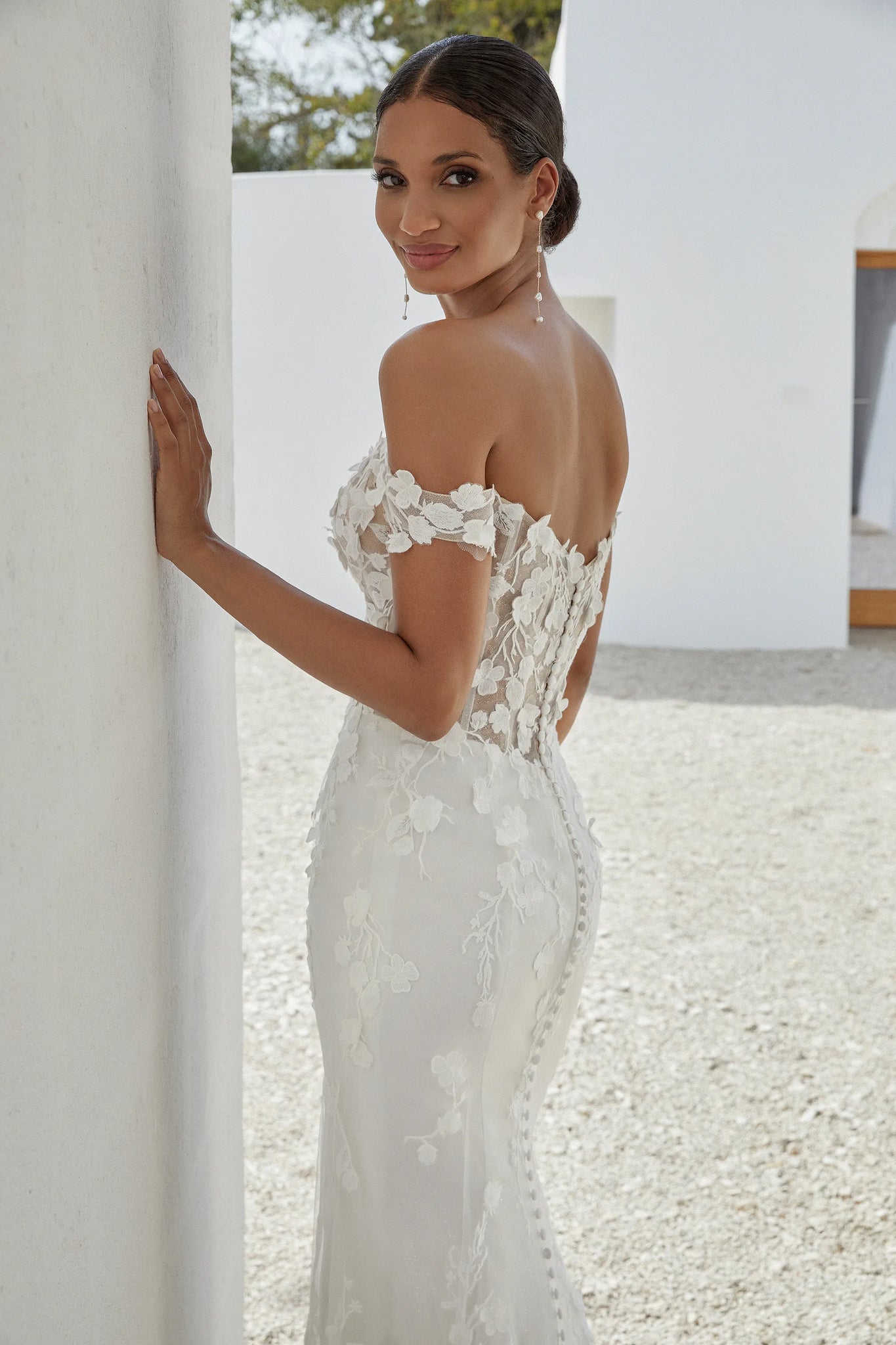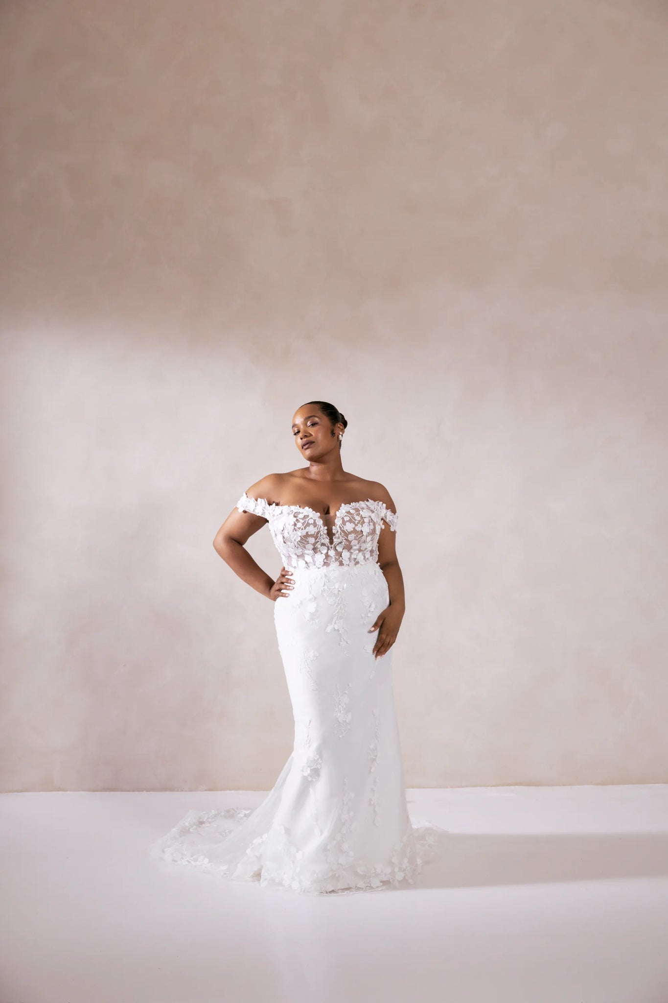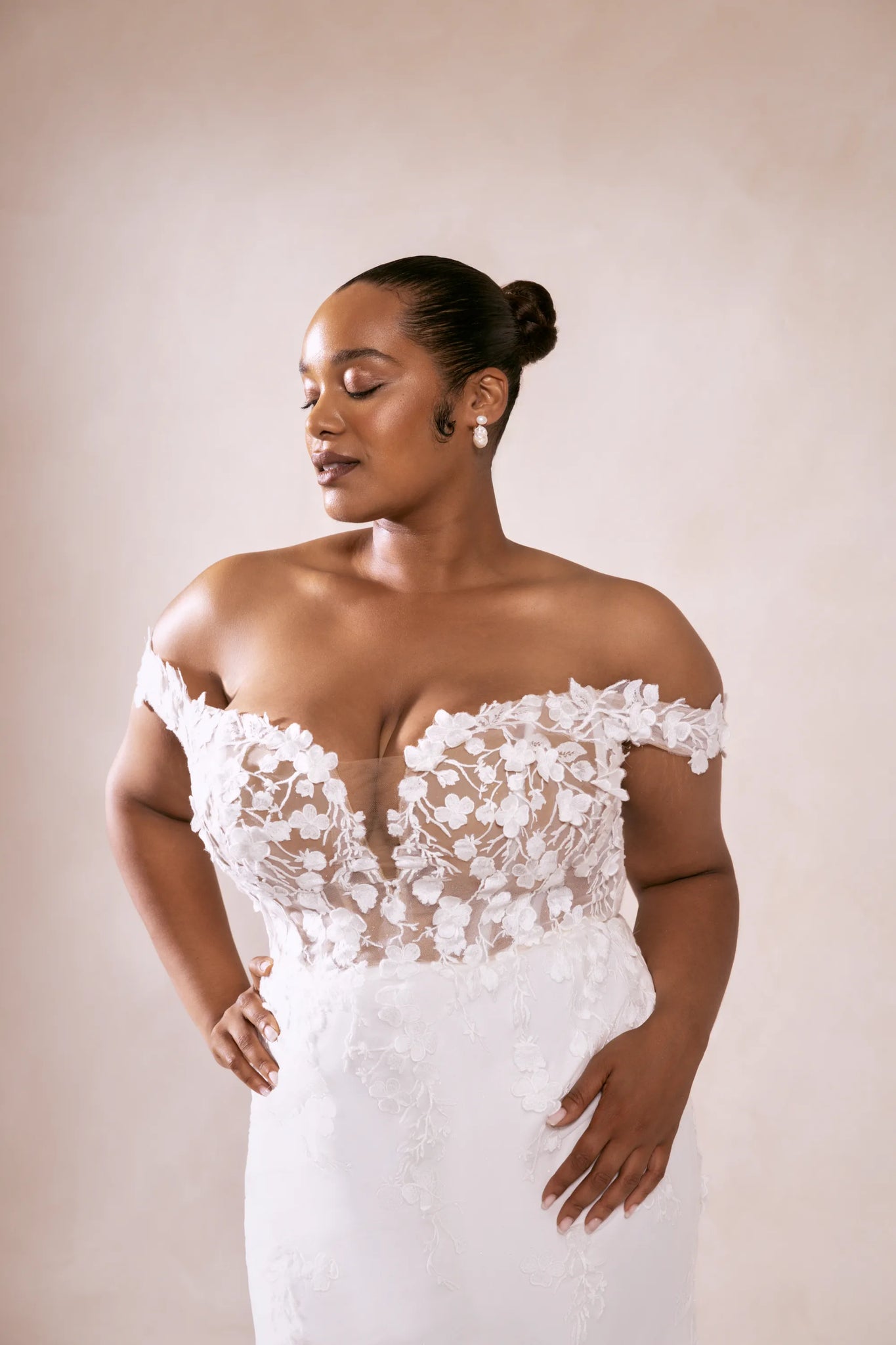 Ariana - Sparkle tulle fit and flare dress with sheer bodice and plunging off the shoulder neckline. Gown adorned with matte cotton lace appliques accented with scattered 3D appliques overtop. Complete with tulle covered buttons extending down back to end of chapel length train. Version with front bodice lined to side seams