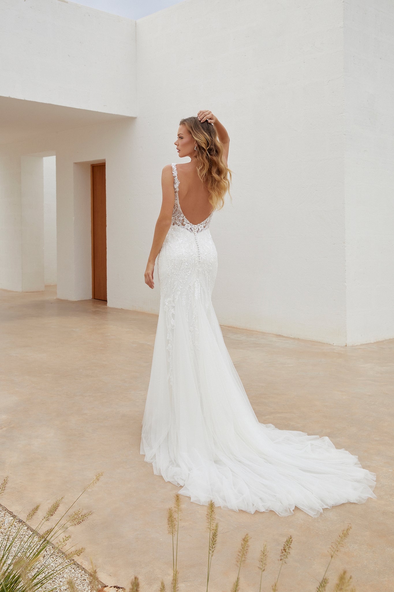 Renee - Square neck fit and flare with sheer bodice detailed with exposed boning and subtle demi cup seaming. Gown embellished with allover beaded and sequined lace appliques. Skirt detailed with soft tulle godets. Open V-back complete with tulle covered buttons and a chapel length train. Finished with jersey lining. Version with fully lined bodice available as 11357LND.