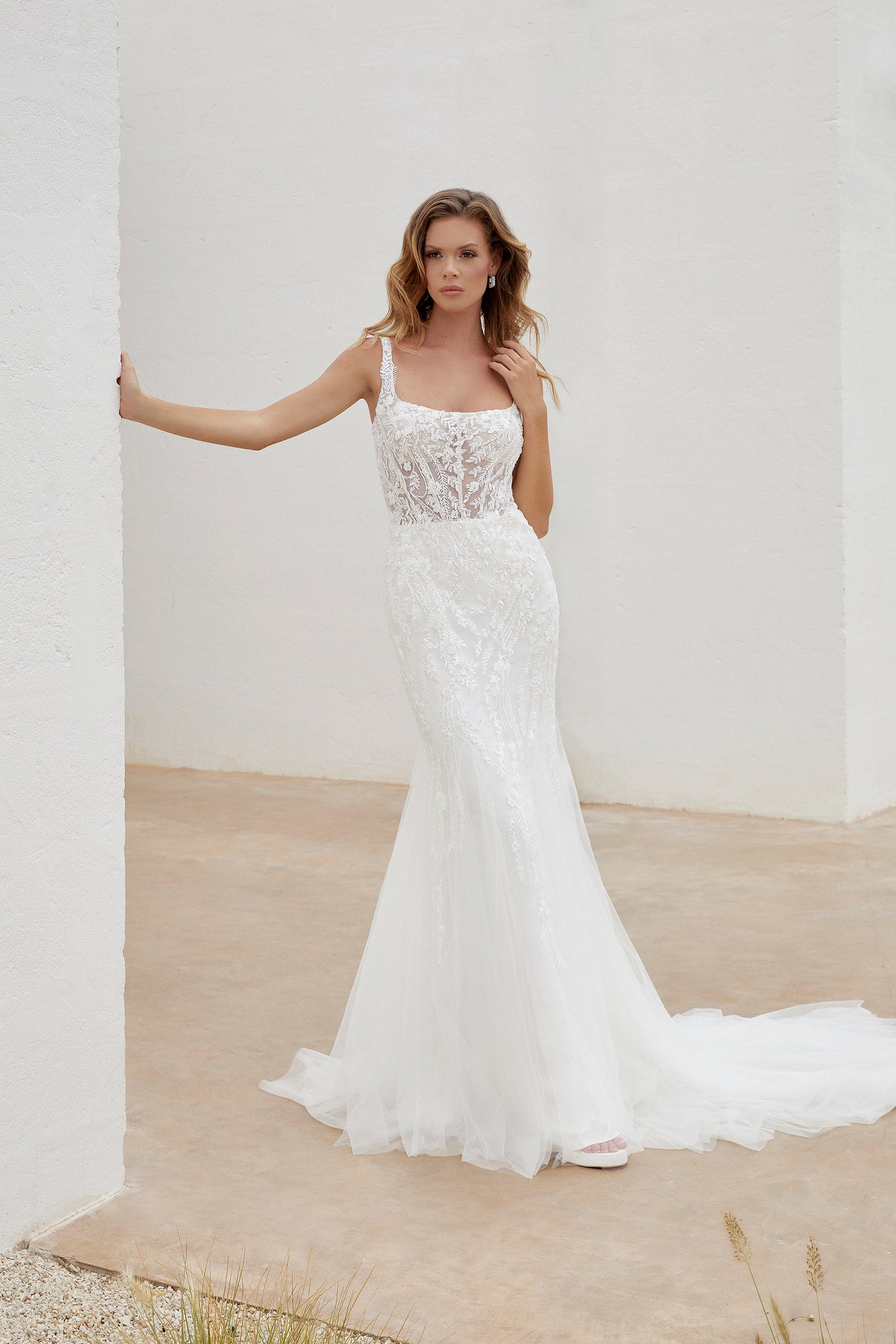 Renee - Square neck fit and flare with sheer bodice detailed with exposed boning and subtle demi cup seaming. Gown embellished with allover beaded and sequined lace appliques. Skirt detailed with soft tulle godets. Open V-back complete with...Read more