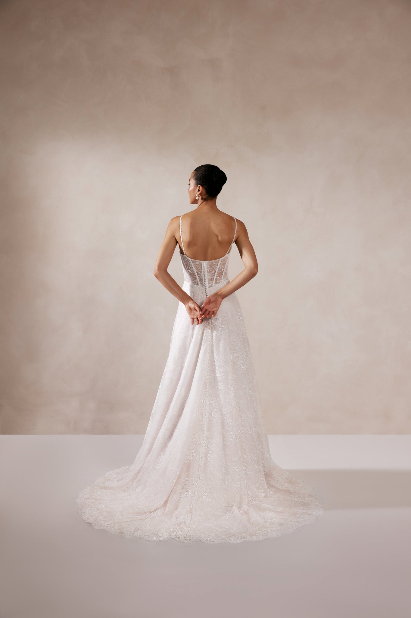 Allover Chantilly lace A-line gown with bikini neckline. Features gathered detailing at center neckline. Spaghetti straps are adorned with tonal sequins, seed beads, crystals and embellishments. Glitter tulle sparkles beneath Chantilly lace layer. Illusion bodice reveals exposed boning. Chantilly Lace skirt layer is finished with a scalloped lace edge. Complete with buttons from back neckline to end of chapel length train.