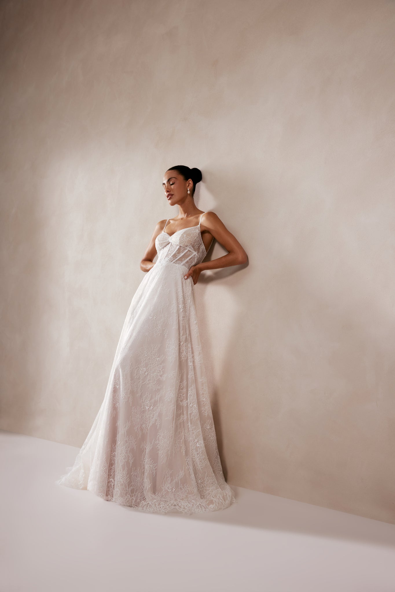 Allover Chantilly lace A-line gown with bikini neckline. Features gathered detailing at center neckline. Spaghetti straps are adorned with tonal sequins, seed beads, crystals and embellishments. Glitter tulle sparkles beneath Chantilly lace layer. Illusion bodice reveals exposed boning....Read more
