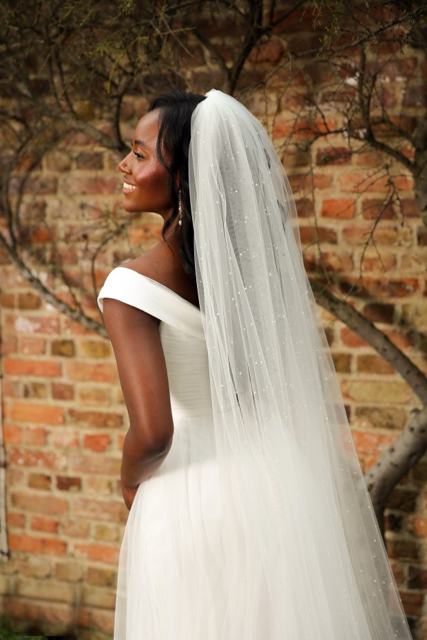 Scattered pearls and crystals adorn this veil, beautifully catching the light as you move. Available in any of our single tier or two tier sizes, Shown in a 98″ single tier. If ordered as a two tier, the blusher will be plain.