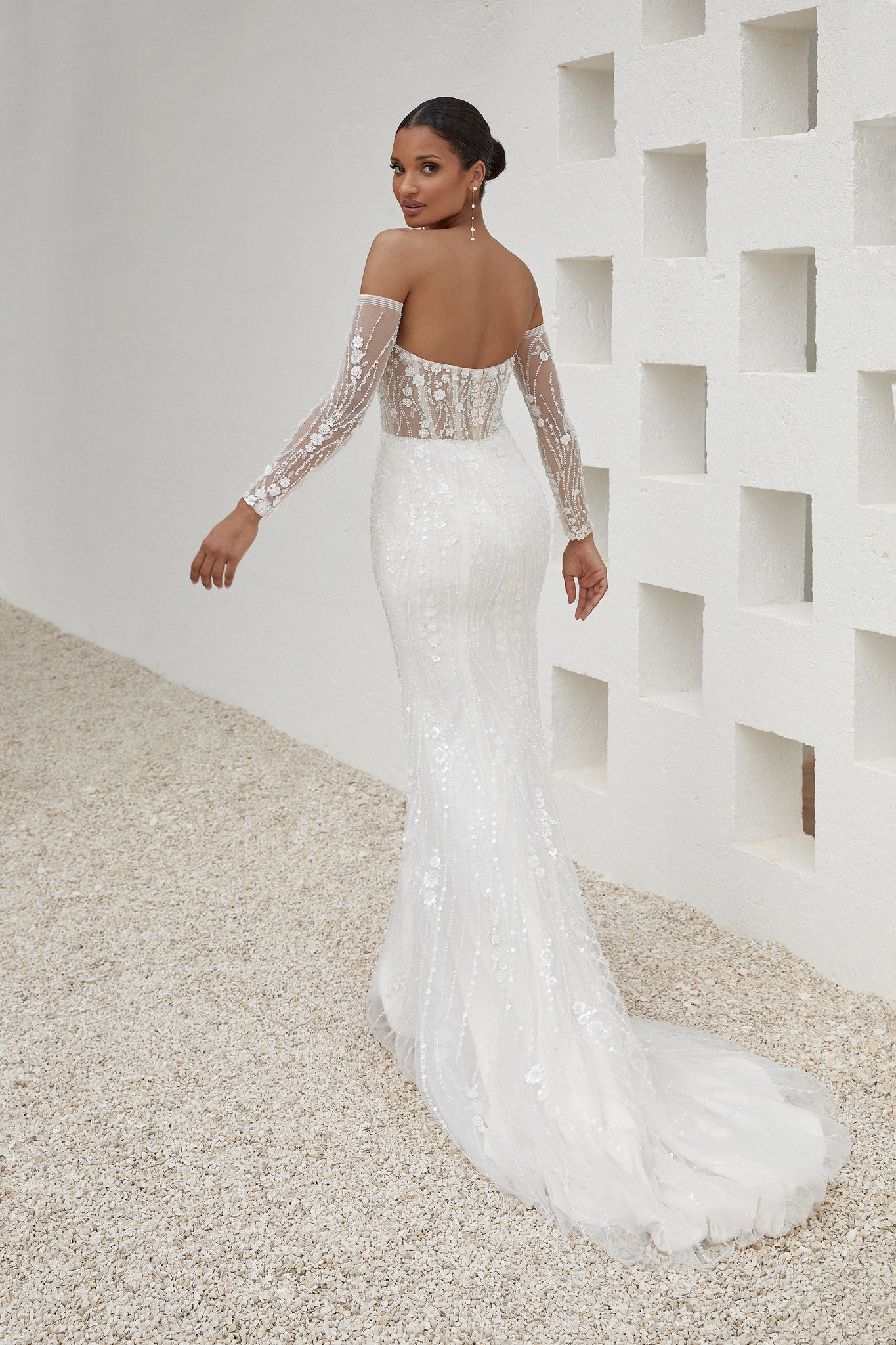Strapless allover beaded fit and flare with plunging sweetheart neckline. Sheer bodice detailed with demi cups and exposed boning. Finished with jersey lining and chapel length train. Paired with matching off the shoulder long sleeves, sold separately as 11361SL £195
