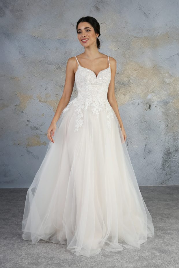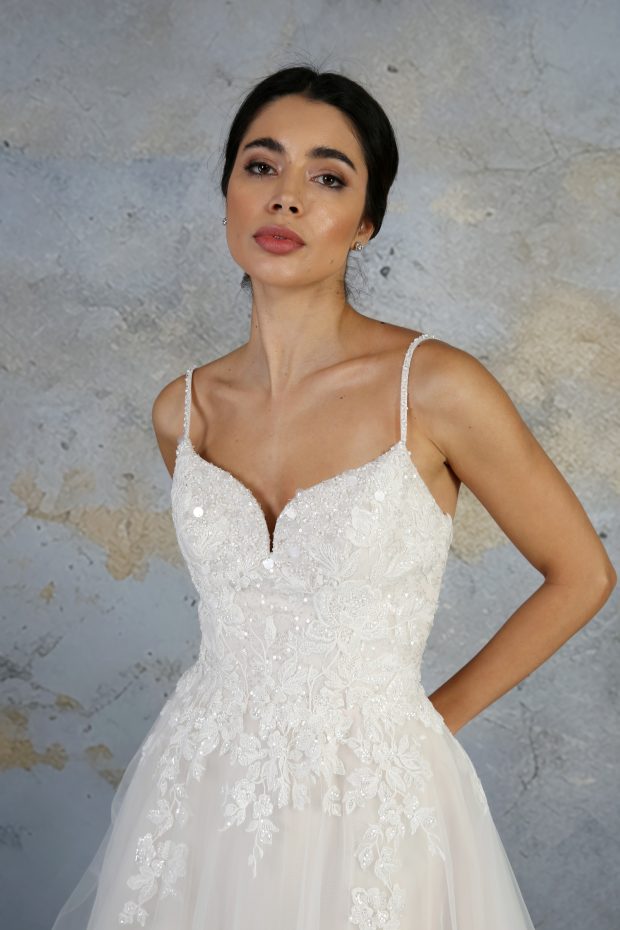 A striking A-line dress with a modern sleeve cape design feature and the most flattering lace placement. The combination of organza, tulle and lace give this dress a romantic and floaty look, with a boho feel, that is finished wonderfully with the daintiest beading along the sleeve edge and the neckline.
