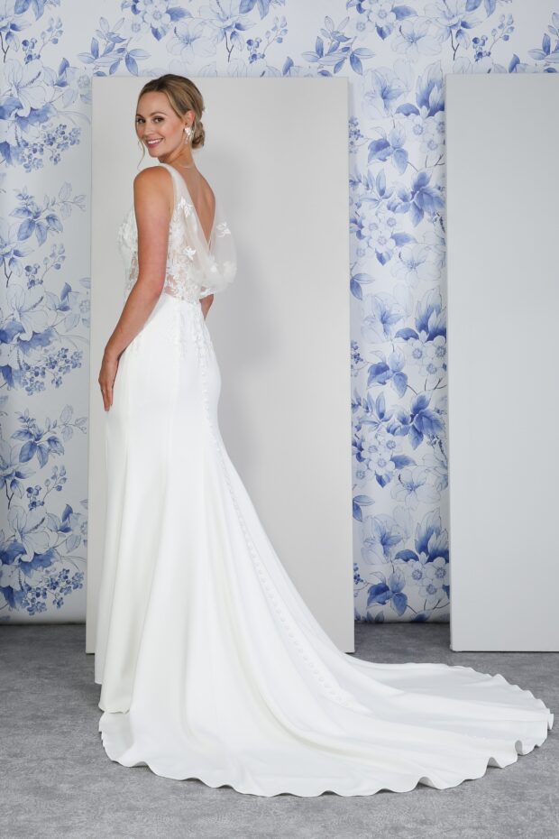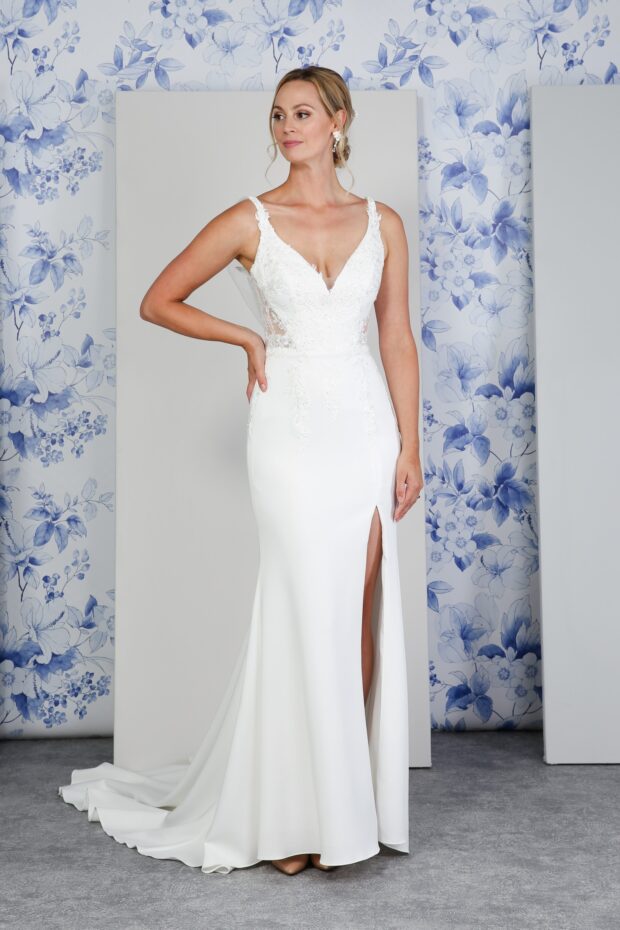 A special bridal gown with jersey skirt and lace bodice. The front slit adds a modern feel. The bodice features unlined sides for a cut out effect, serving to narrow the waist. On the back a tulle and lace cowl adds a lovely, floaty texture. Sparkly lace adorns the bodice and the top of the skirt so that you glisten in the light. A gorgeous style for the modern bride. This dress is available in Ivory only, as pictured.