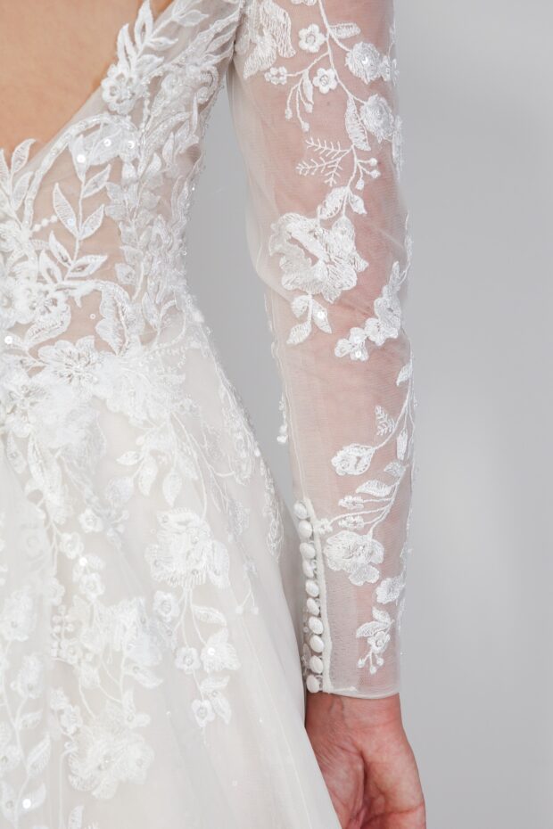 This romantic lace dress features a body-sculpting bodice with stunning wildflower lace. Light-catching sequins are peppered across the layered tulle skirt, adding a gorgeous sparkle to the soft movement of the A-line shape. The stunning open neckline gives this style such a refined and elegant feel; detachable long lace sleeves allow you to transform your look between the ceremony and the reception. This dress is available in with champagne lining as pictured or in Ivory.