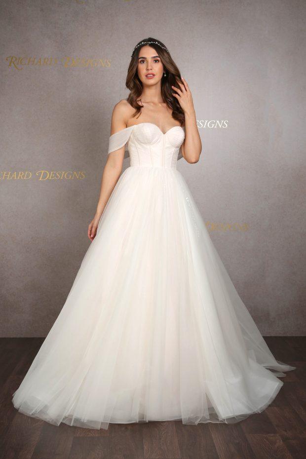 Elegant and romantic, this dress oozes effortless charm. The bodice has exquisite detailing in the tightly pleated tulle which is overlaid with exposed boning in the colour of the skirt. The tulle is shaped delicately over padded cups at the front and tapered gently into the centre at the back where covered buttons and loops conceal an invisible zip. From the bodice float pleated, sheer tulle off-the-shoulder straps that sit lightly on the upper arm. The attention to detail in this dress continues in the soft tulle and organza skirt. Gathered fully into the waist to create volume, soft tulle is layered over structured tulle and organza over the coloured or ivory skirt. Rivulets of fine beading and sequins slip from the waist over the tulle, the gathering allowing them to move in and out of the light offering hints of subtle sparkle. The skirt is supported by a net underskirt from below the hip whilst the tulle and organza train is allowed to fall sheer and ethereal to the back of the dress. Shown with Ivory tulle and organza over Champagne skirt. Also available in all Ivory.
