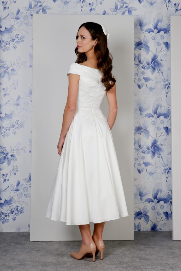 A beautiful tea length dress with flattering pleating at the waist, and soft off the shoulder sleeves. The A-line skirt and extra volume in the back, as well as the added undernets, make this dress perfect for twirling...Read more