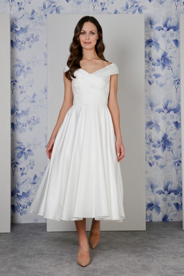 A beautiful tea length dress with flattering pleating at the waist, and soft off the shoulder sleeves. The A-line skirt and extra volume in the back, as well as the added undernets, make this dress perfect for twirling in! The delicate lace has been finished with shimmering sequin beading.