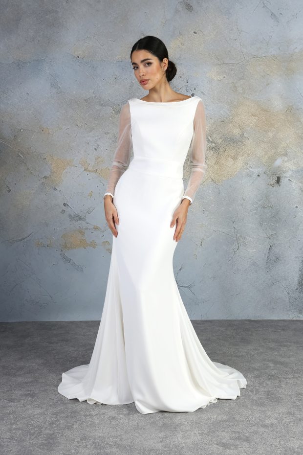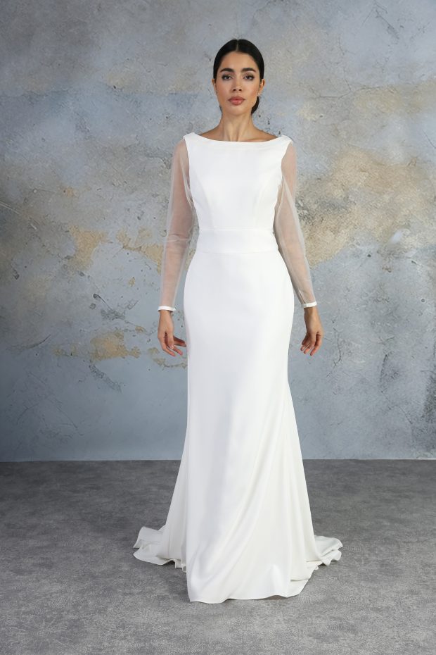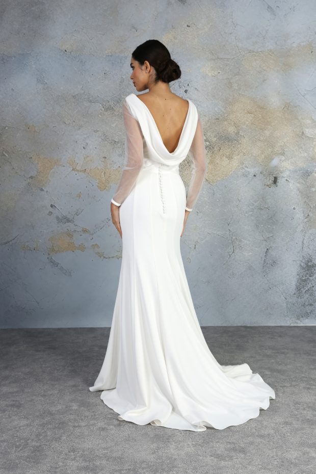 This elegant bridal gown is constructed in stretch crepe and matte satin. The bateau neckline creates a stunning shape which is complemented by the delicate long sleeves. To the back is a gorgeous low draped cowl with button fastening. The gorgeous fabric falls down into a flowing train. Available as pictured in Ivory.