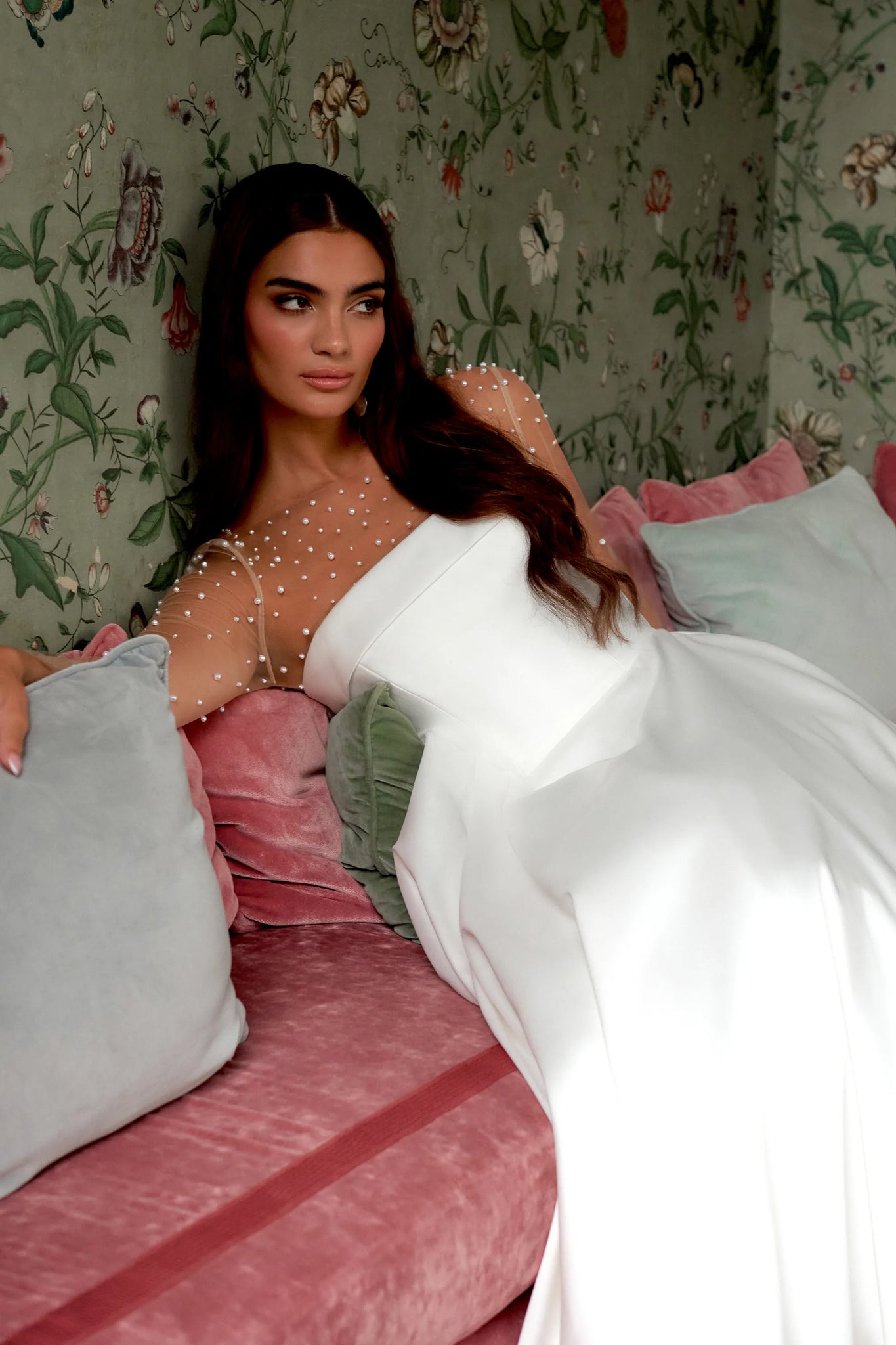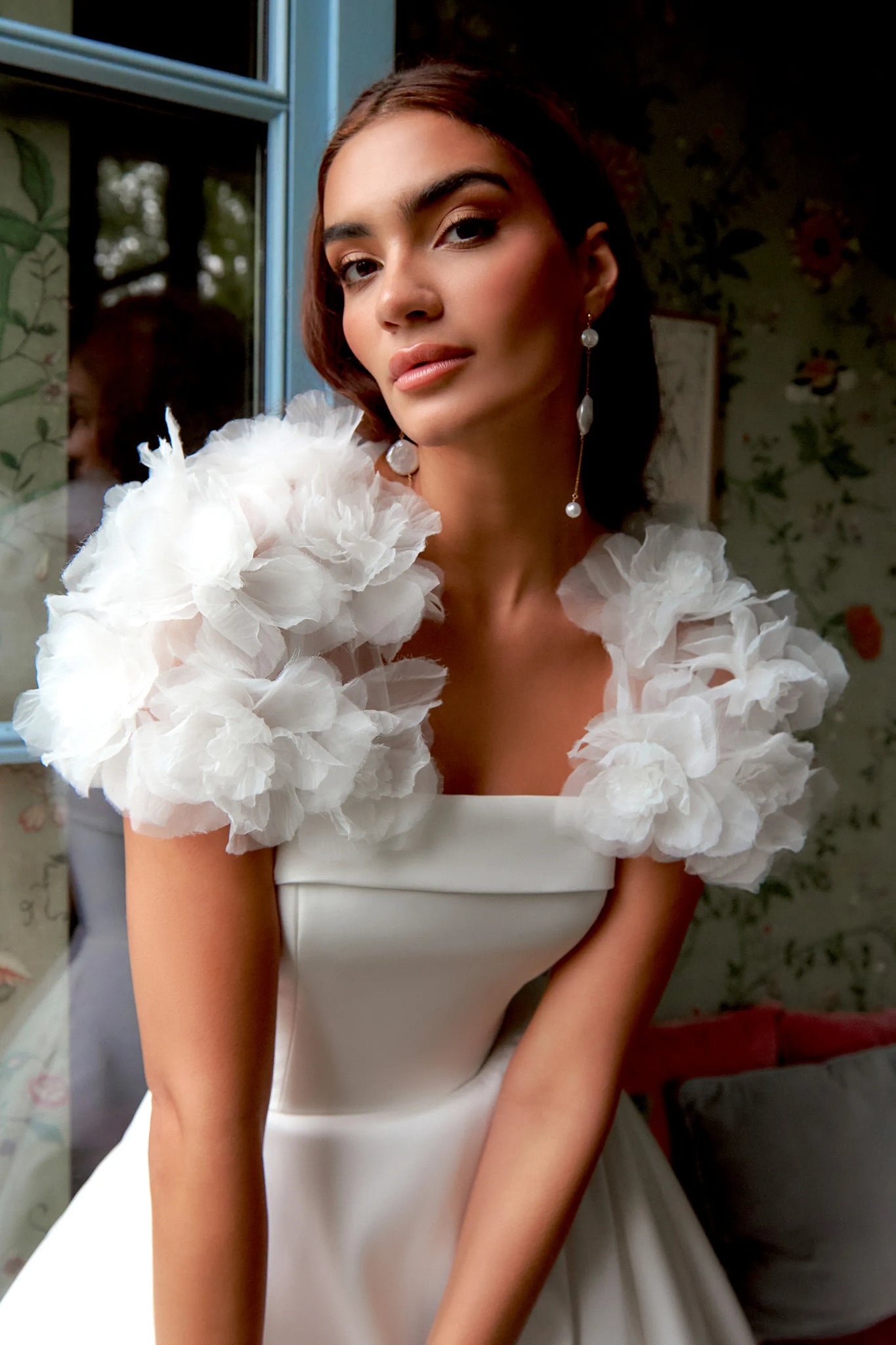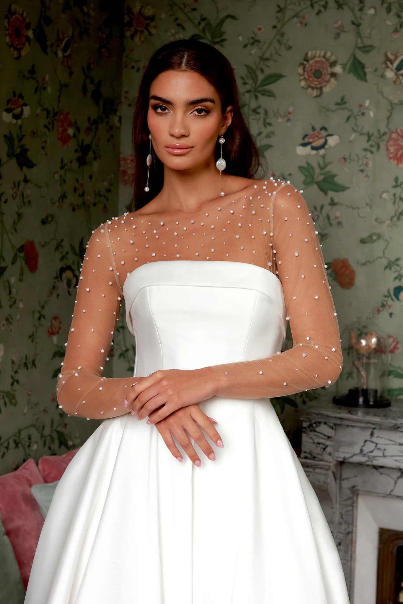Timeless and classic, this Mikado ball gown brings a fresh take on modern minimalism. The clean bridal gown is set off with an elegant cuffed straight neckline adding a regalness to the look. Pockets enhance the full circular...Read more