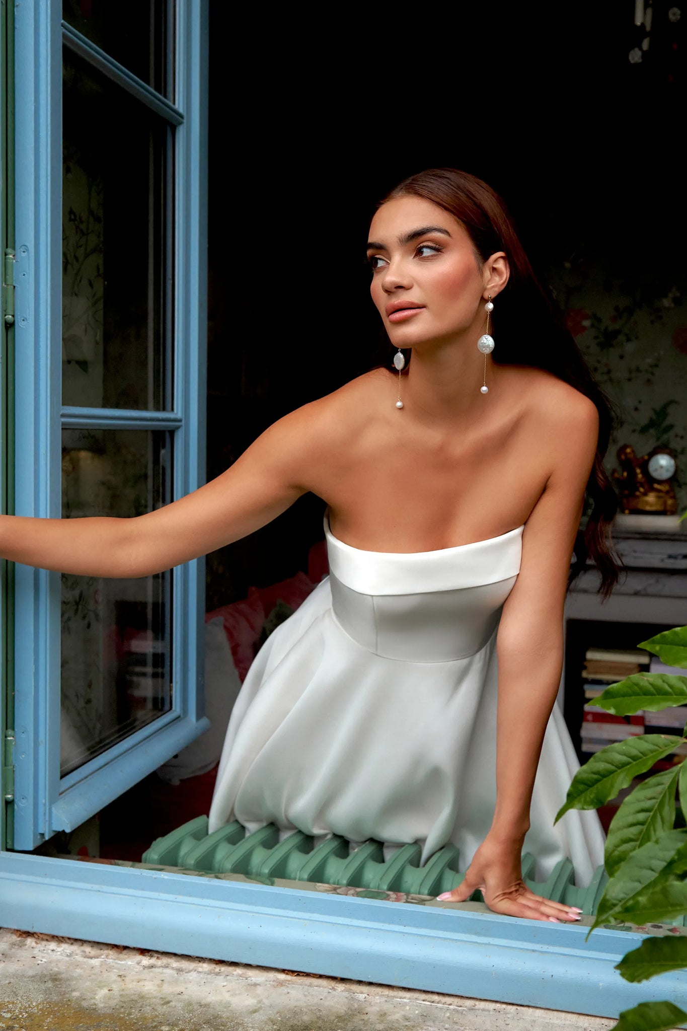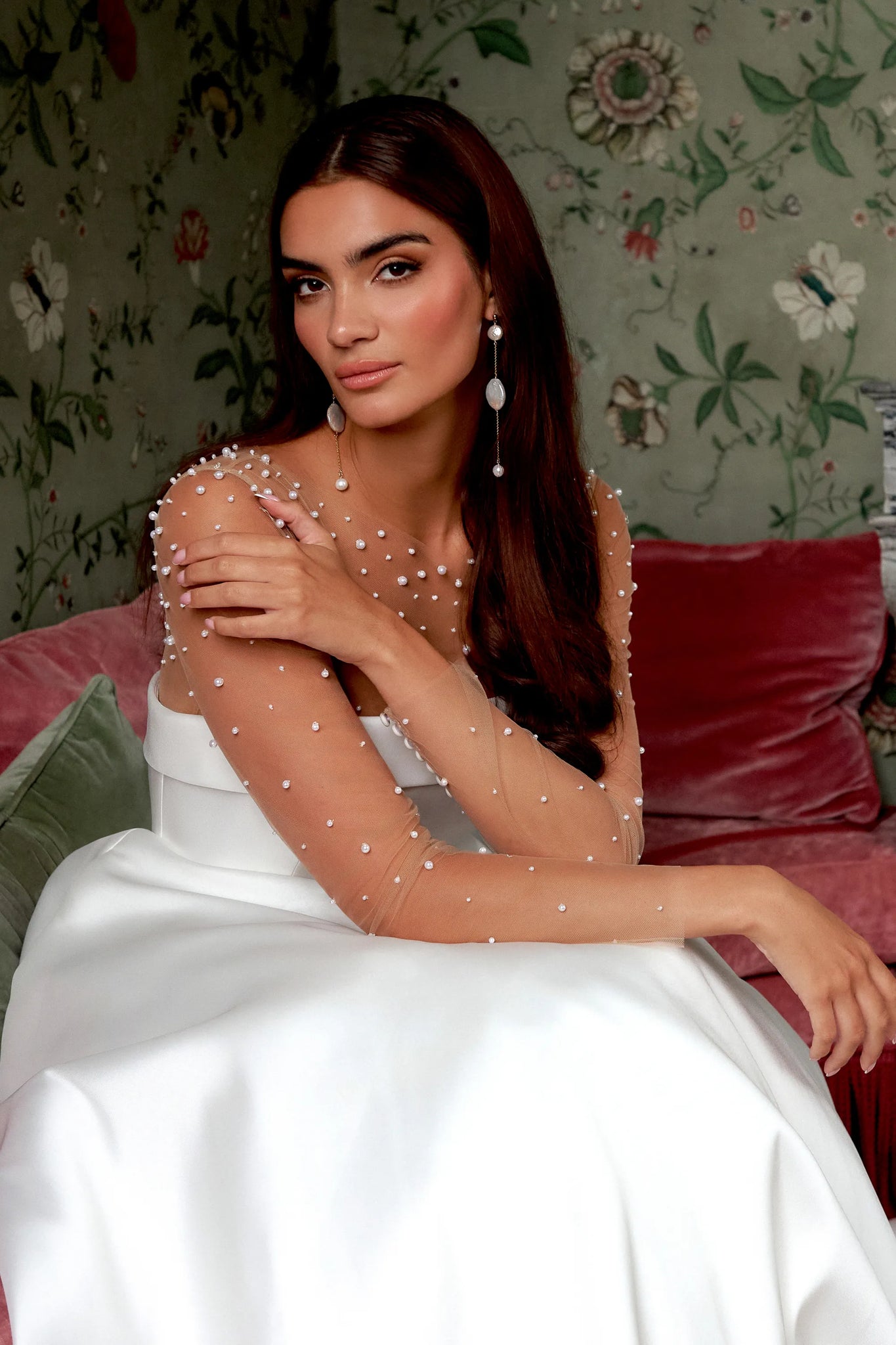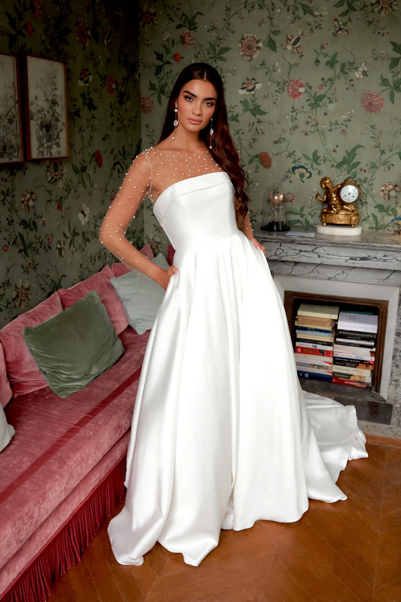 Timeless and classic, this Mikado ball gown brings a fresh take on modern minimalism. The clean bridal gown is set off with an elegant cuffed straight neckline adding a regalness to the look. Pockets enhance the full circular cut skirt while covered buttons cascade down the back to finish off the chapel length train.