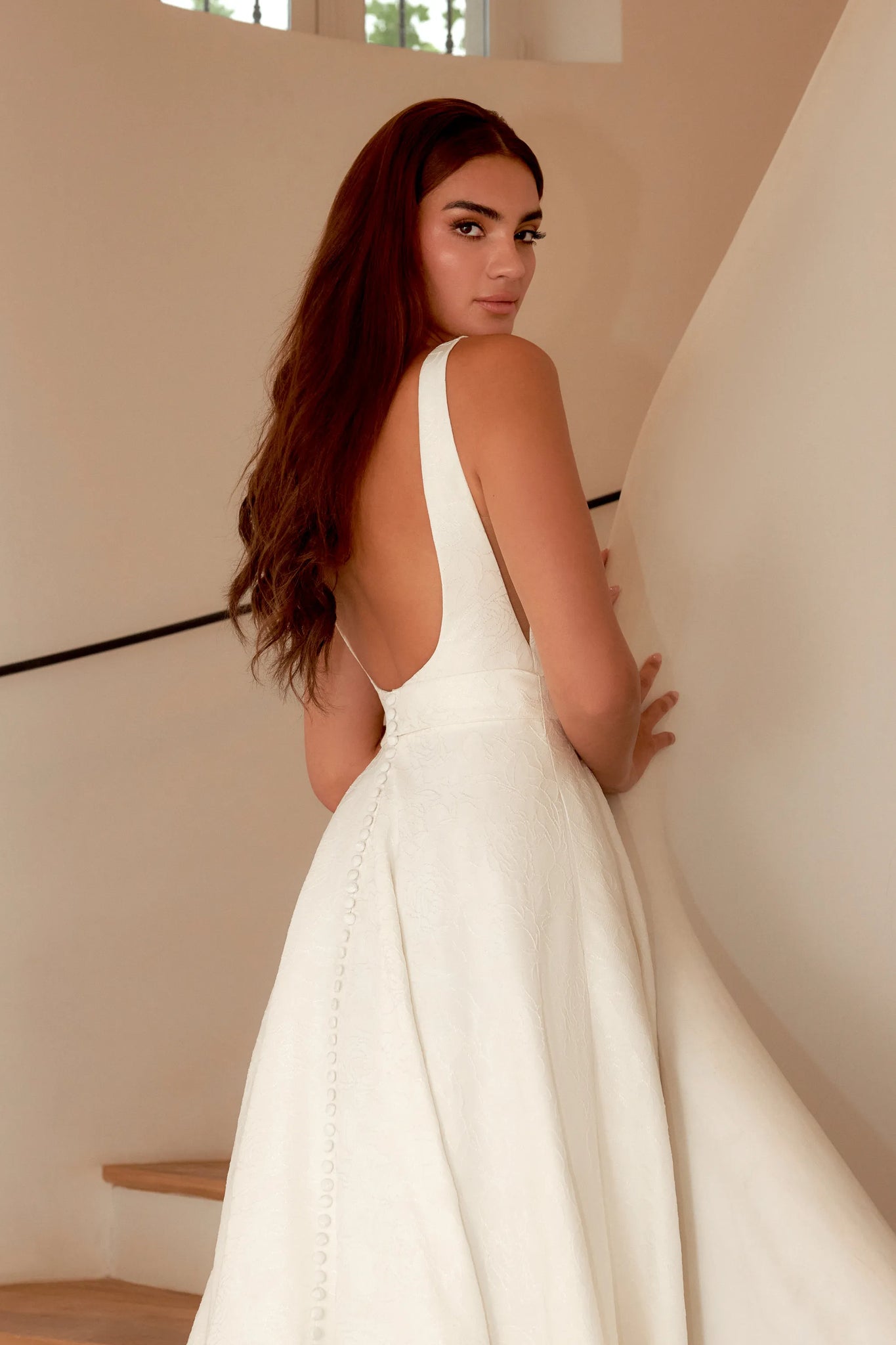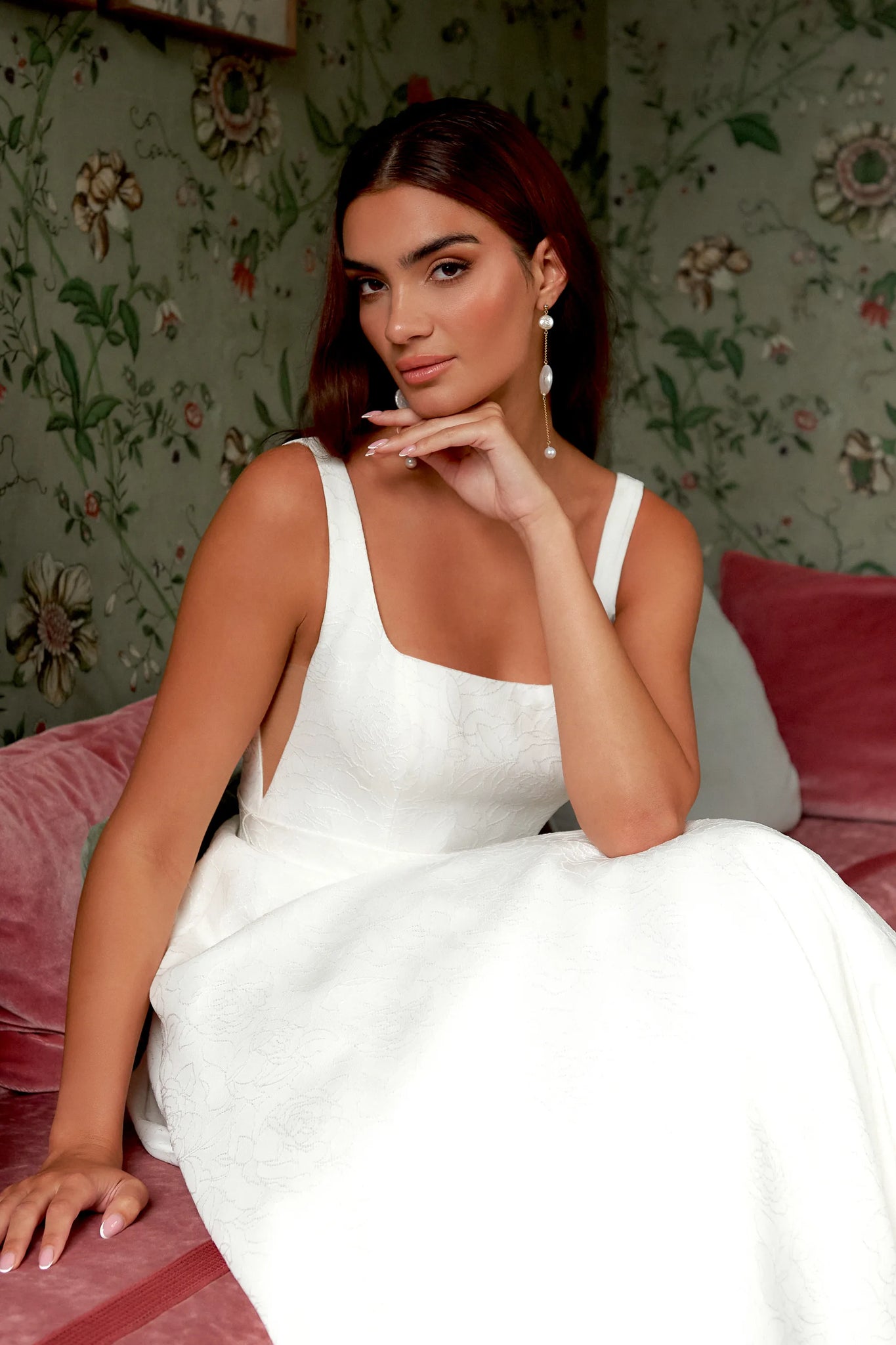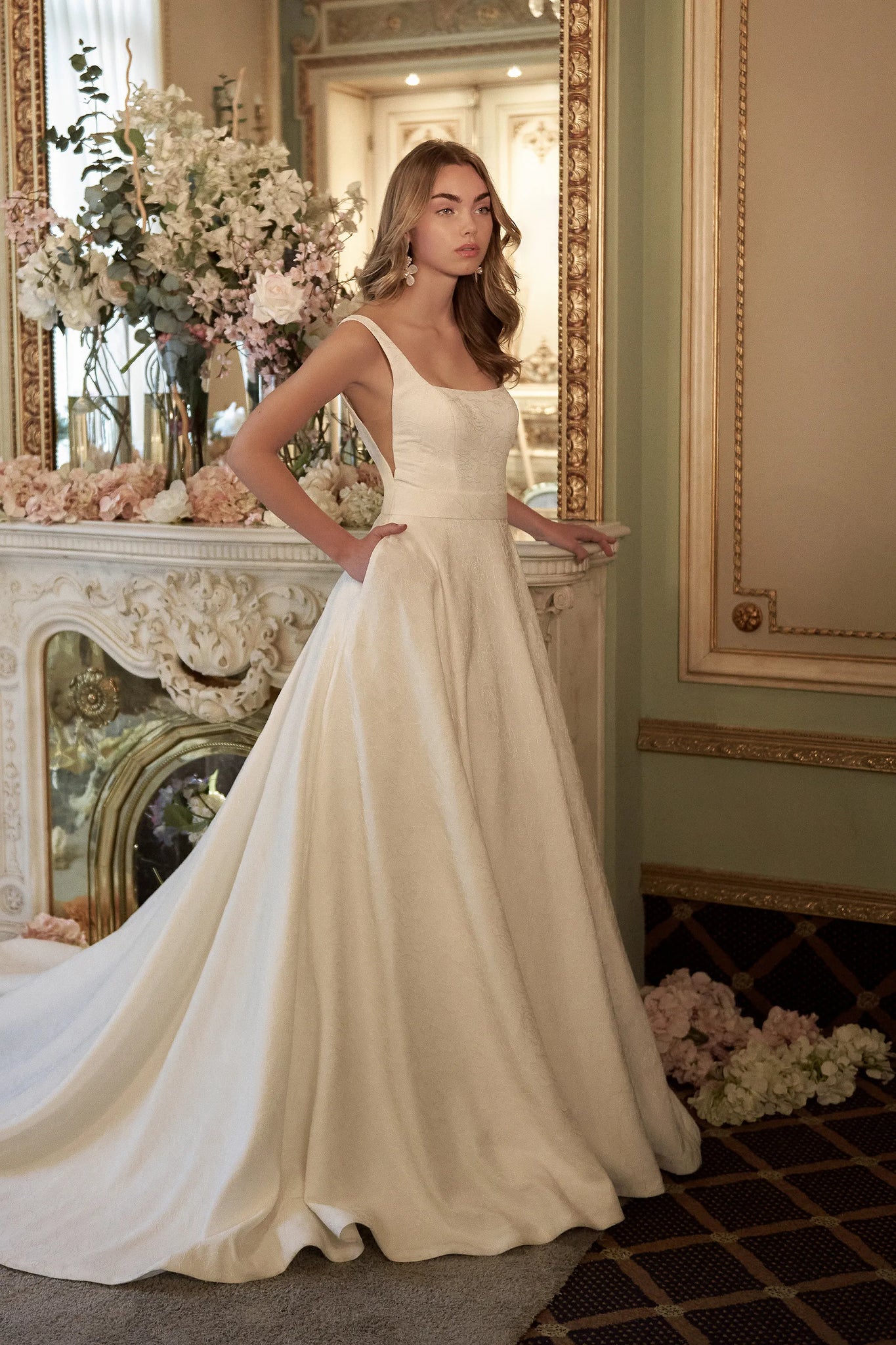 Feel like royalty in this graceful ball gown. The style is designed in a floral brocade fabric, giving it a it an elevated, romantic look. It features a modern square neckline accented with V-side cutouts and a low square back. A matching detachable belt defines the natural waist while pockets detail the full skirt. The bridal gown is finished with brocade covered buttons cascading to the end of the chapel length train. For a more classic look, this style can also come in a stretch Mikado version.