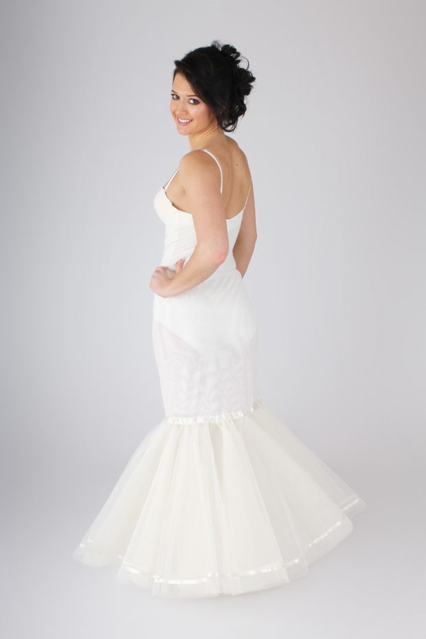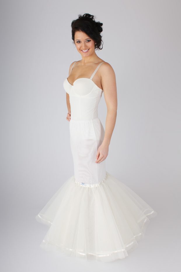 Three layers of beautifully full petticoat nets embellish this thoughtfully designed modern underskirt. A double layer of smooth soft powernet will shape you from waist to knee giving a refined and sophisticated silhouette while the extravagant layers of nets support and lift the hem of your stylish fishtail or mermaid gown. The single hoop measures approximately 80″ (2m) giving you confidence to float around the dancefloor all night long as the layers of your dress are kept effortlessly away from your dancing shoes from dawn till dusk. A hand-tied blue bow is lovingly added for your ‘something blue’. Available to order in Ivory, Antique or White.
