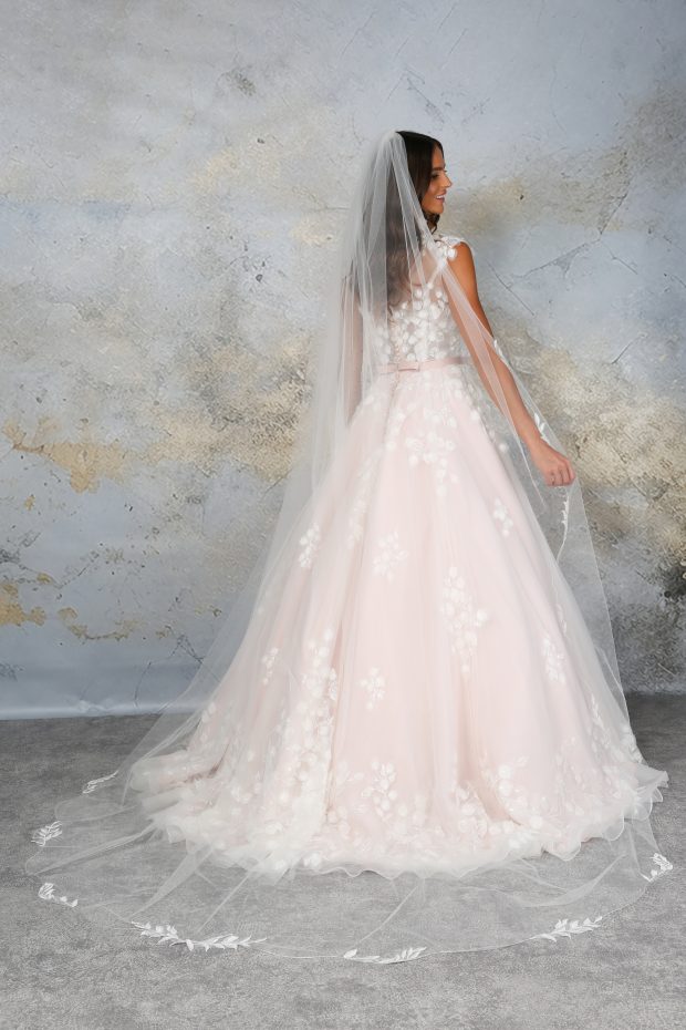 Beautiful cascading embroidered edge veil, finished with embroidered leaf appliques carefully placed along the edge, creating a simple yet impactful look. This veil would be perfect to pair with gowns that feature embroidery. Shown here in a 98″ single tier length. It is also available in any our other single and two tier lengths.