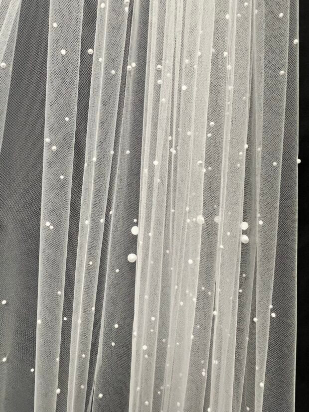 This stunning veil is completely covered in a waterfall effect of pearls for an incredible statement look. Finishing with our modern tapered shape forless volume at the comb, and a neat cut edge for a clean finish, this contemporary veil will truly make an entrance.