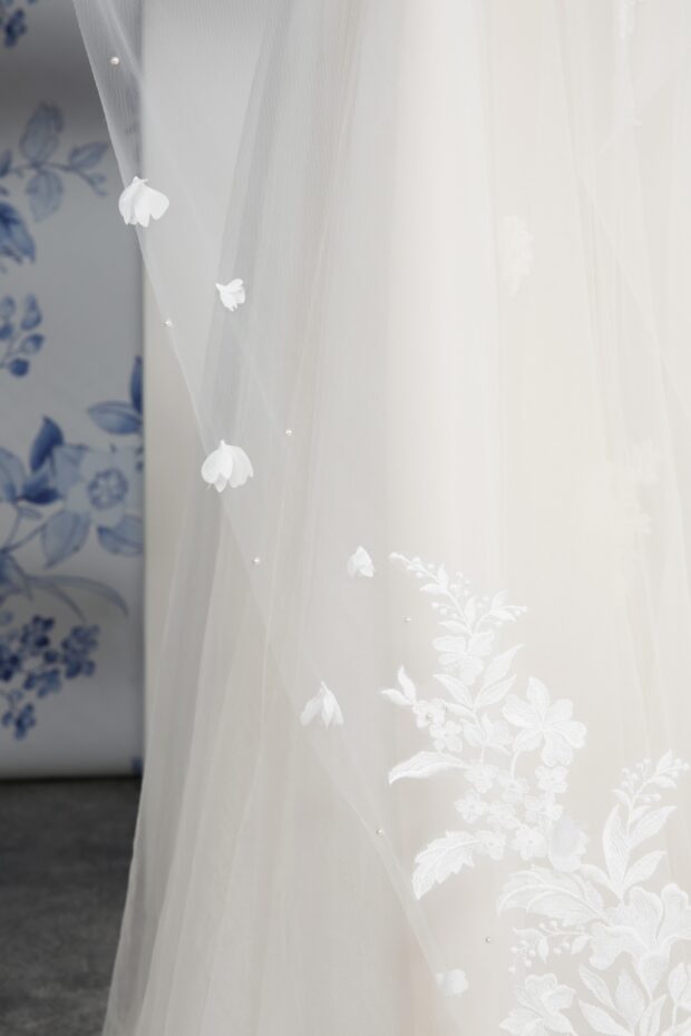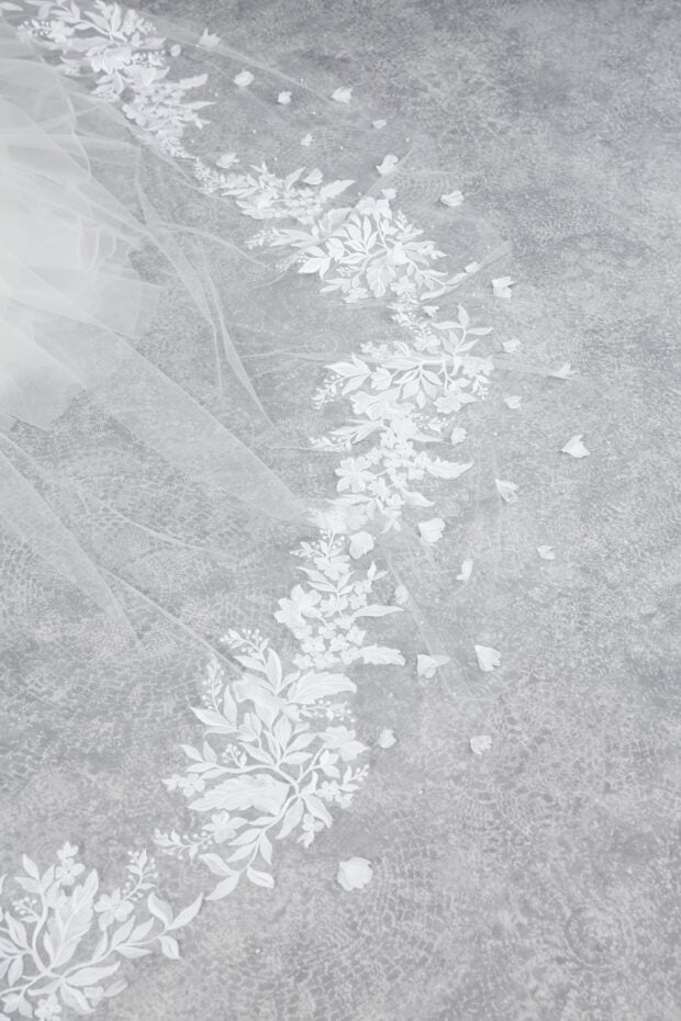 Floral lace appliques surround the train of this veil, with 3D chiffon flowers and pearls scattered along the edge. A gorgeous, textured design perfect for every bride.