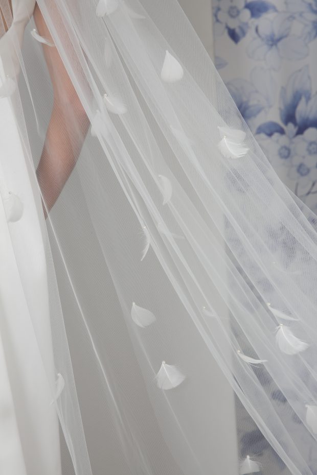 This unique veil is covered in a scatter of petal-shaped feathers, each adorned with a shimmering pearl. Accessorize your dress with this beautiful veil for a playful and modern twist, giving you plenty of movement as it flows around you all day.