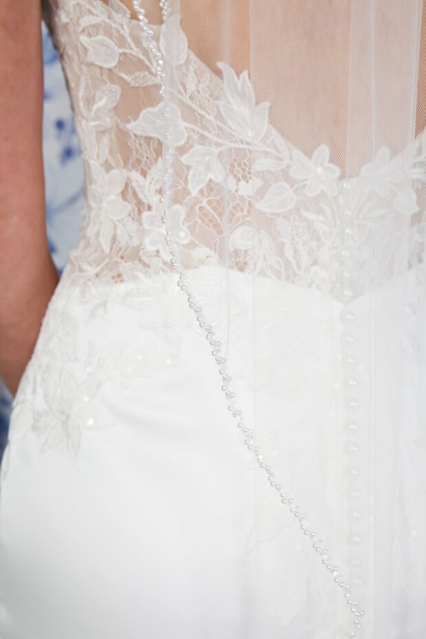 Gorgeous pearls and shimmering beads line the edge of this signature tulle veil. The weight of the beading ensures that the veil falls perfectly and holds its shape as you move, whilst adding a lovely shimmer to your look.
