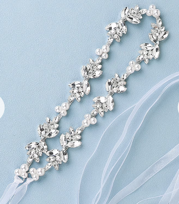 Gorgeous slim diamante chain belt with ivory ribbon tie. Can also be used as a hair accessory.
