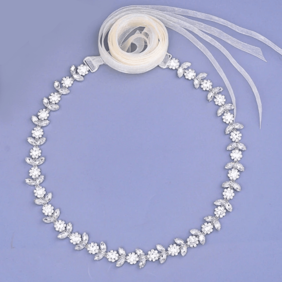 Lovely silver chain belt with flower and leaf design. Ivory organza ribbon tie. Can also be used as a hair accessory.