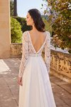 Chiffon A-line featuring allover lace bodice and long sleeves with a plunging V-neckline and V-back. Lace trim details waistline and neckline. Finished with sweep length train.