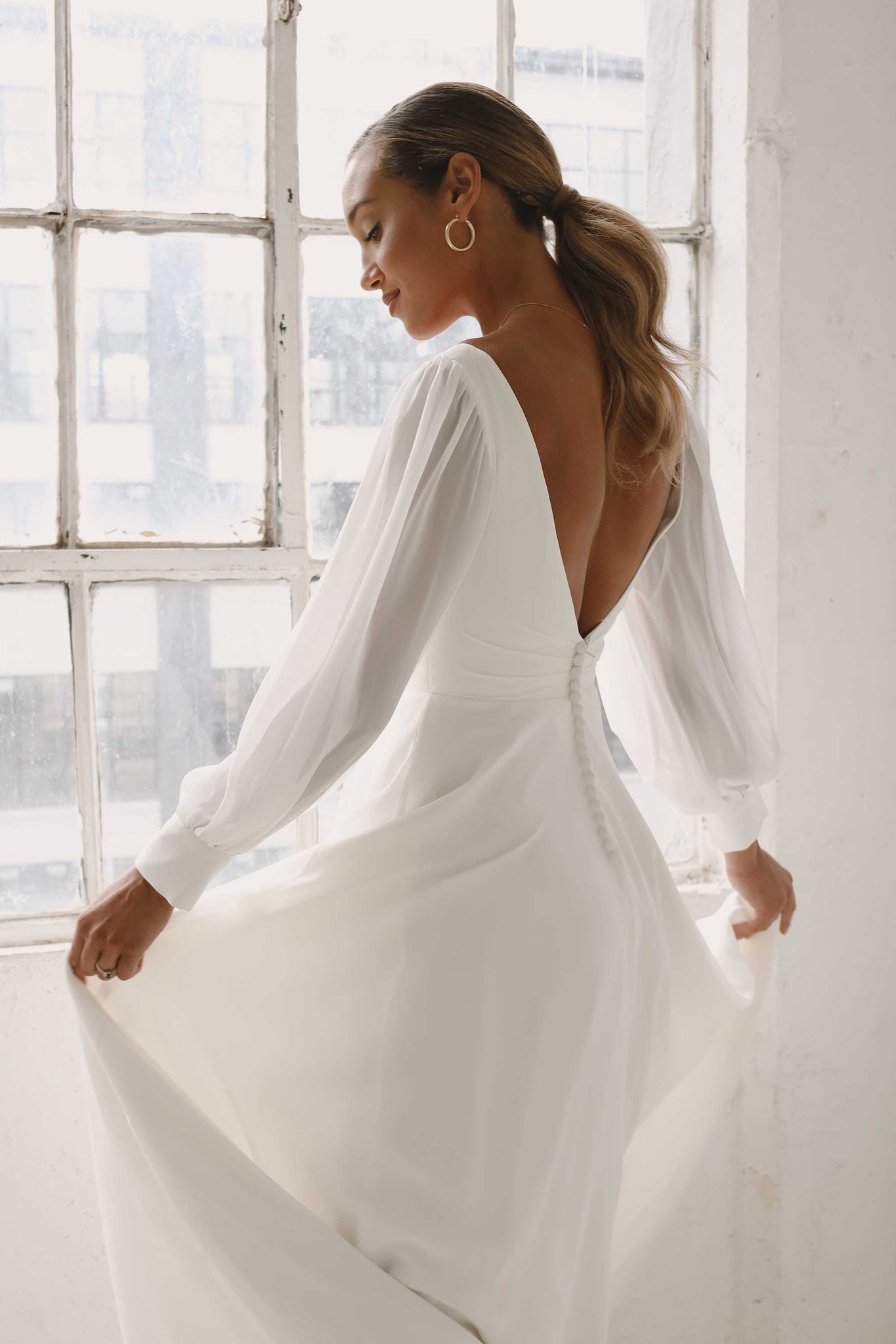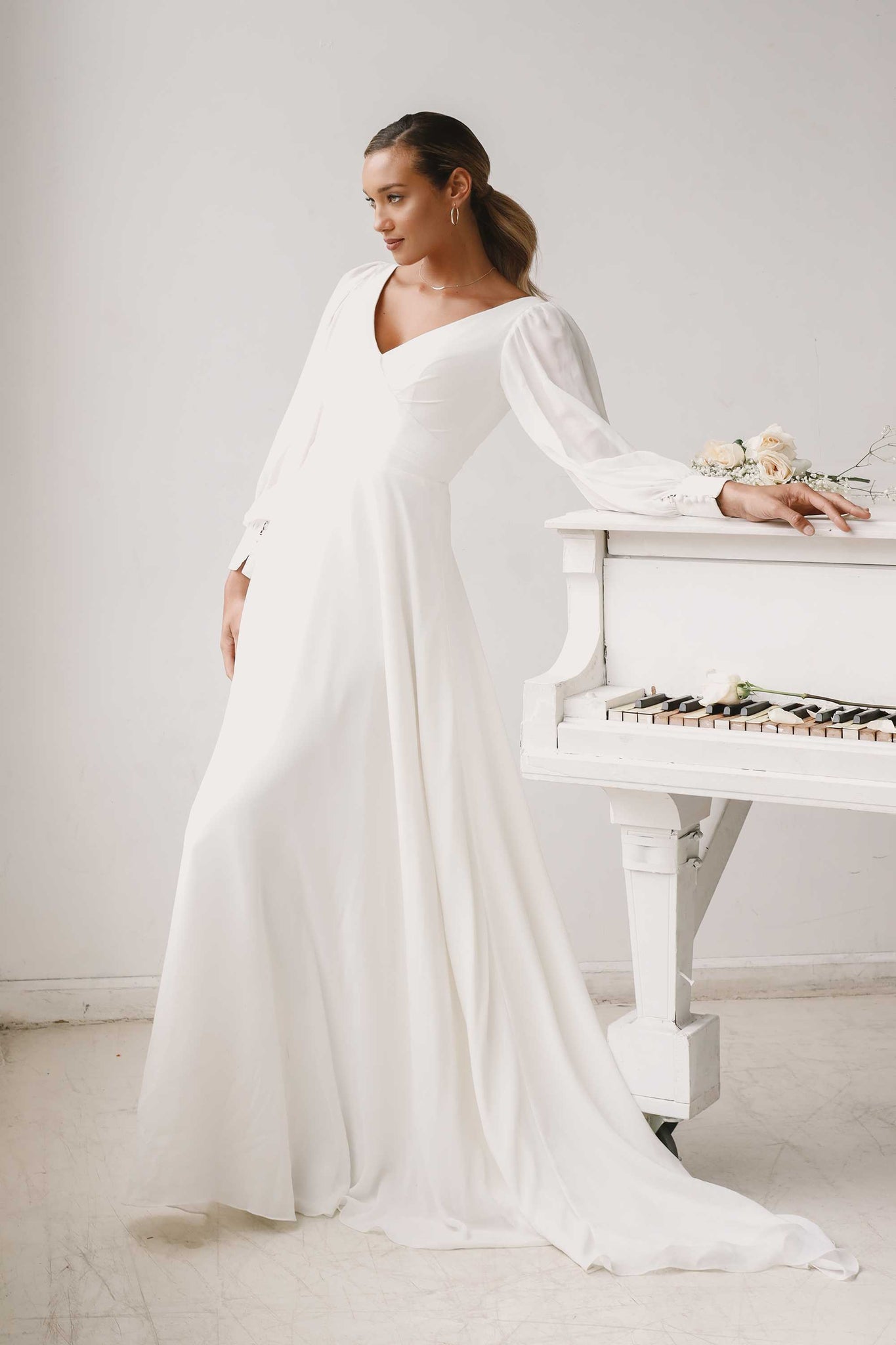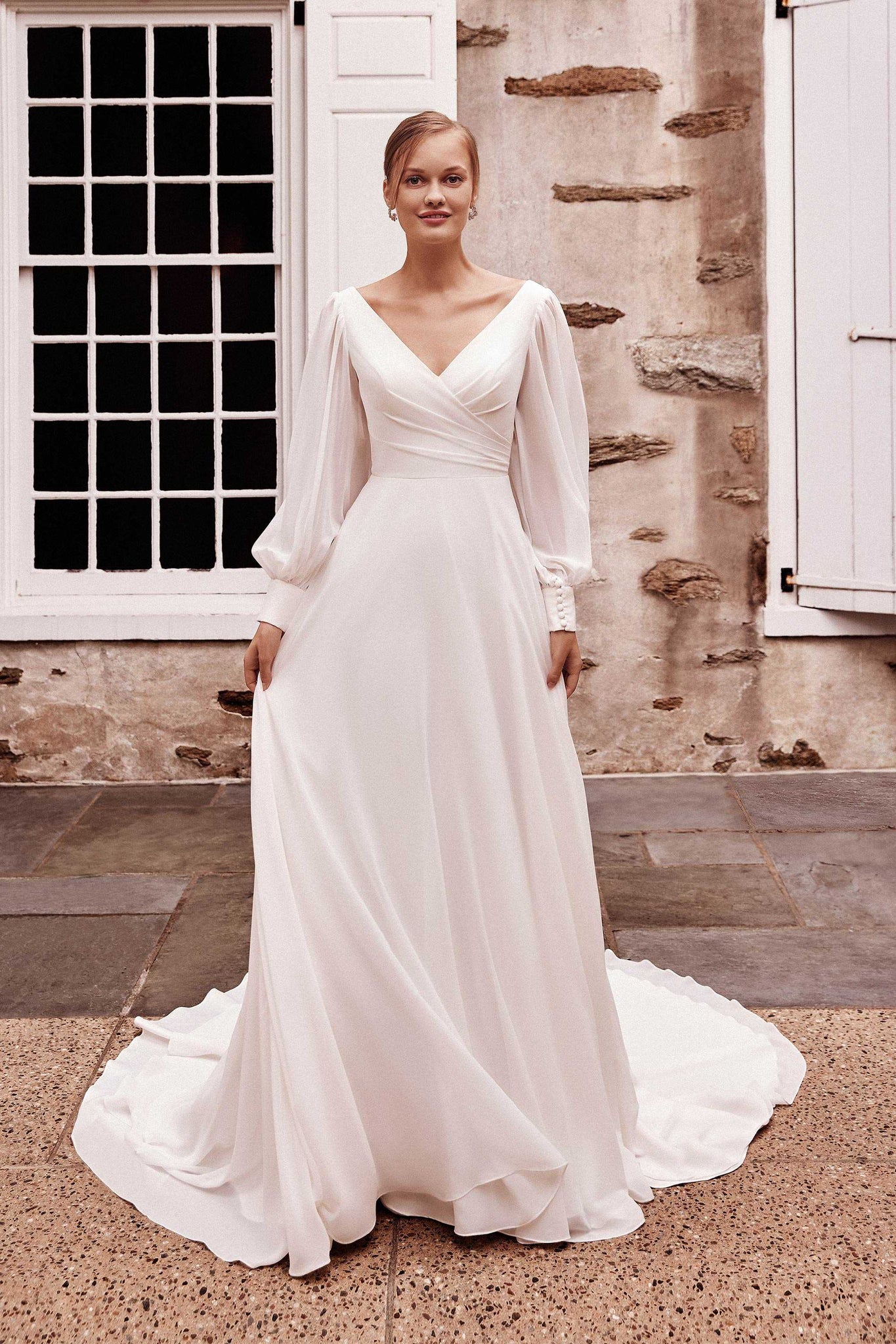 Clean and effortless, this flowy chiffon bridal gown features a modest V-neckline accented with flattering pleating across the front and back of the bodice. The light chiffon bishop sleeves add a fashion-forward touch to this soft look. The...Read more