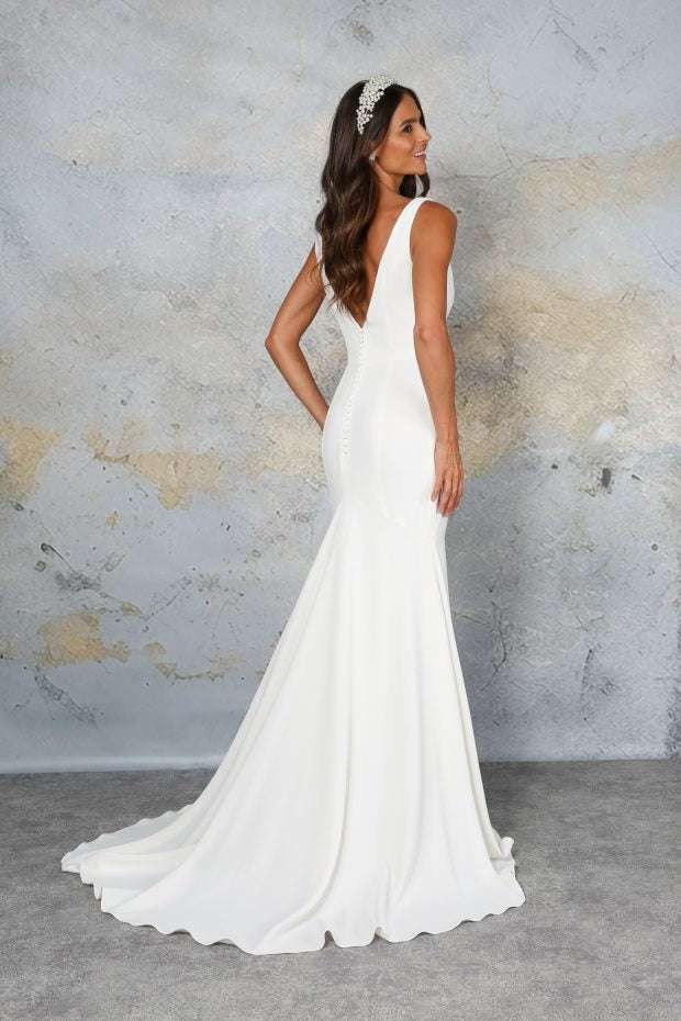 A beautiful square neck bridal gown for the minimalist bride. This dress is made in our super flattering stretch crepe fabric that skims the body and creates a beautiful shape. The bodice has clever seams that draw your eye to waist and flow into the fitted stretch crepe skirt. To the back of the dress is a stunning V-shape detail to showcase your back. This cascades down into some fullness at the back of the dress, which adds drama to the gown with a pretty crepe train.