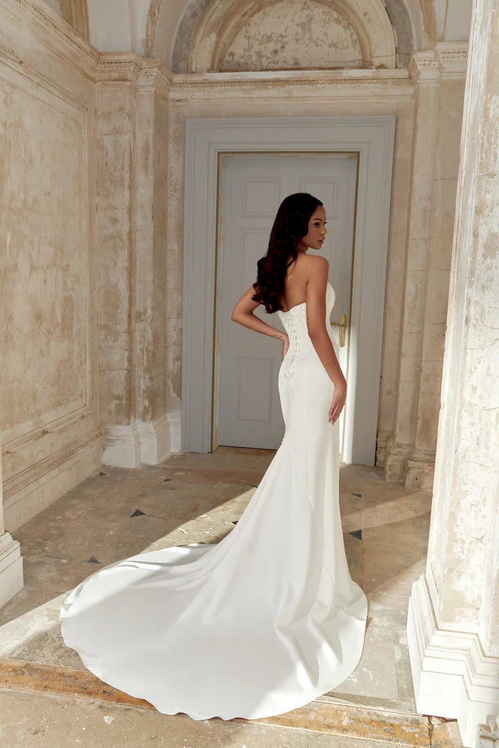 Matte satin fit and flare with pointed sweetheart neckline. Bodice is adorned with lace appliques featuring pearl, sequin, and tonal beading complimenting the neckline and basque waistline. Exposed boning in the bodice flatters the silhouette and adds structure. Back is complete with a lace up corset followed by covered buttons and sparkling lace appliques. Gown is finished with a chapel length train.